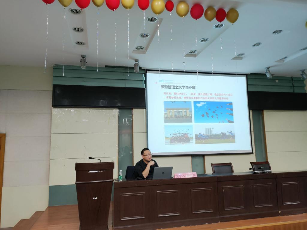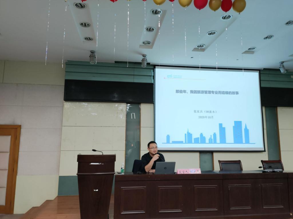 旅游管理专业学习的这四年所获得的幸福感、充实性、专业素养以及综合素质的提升。随后,通过个人工作经历,以及提出旅游管理专业是典型的交叉学科,培养复合型人才,张家兵校友分享了他对旅游管理专业的认识,并从人才优势和擅长的工作领域以及就业方向的选择三个方面进行仔细分析,以“扎实专业学习、关注互联网+旅游、多读人文类书籍、发展专业优势特长”四个方面给同学们提出了面向未来的发展建议。紧接着,从思考商业问题的角度深入讲述了旅游人如何做到以超前思想超过其他商科人。