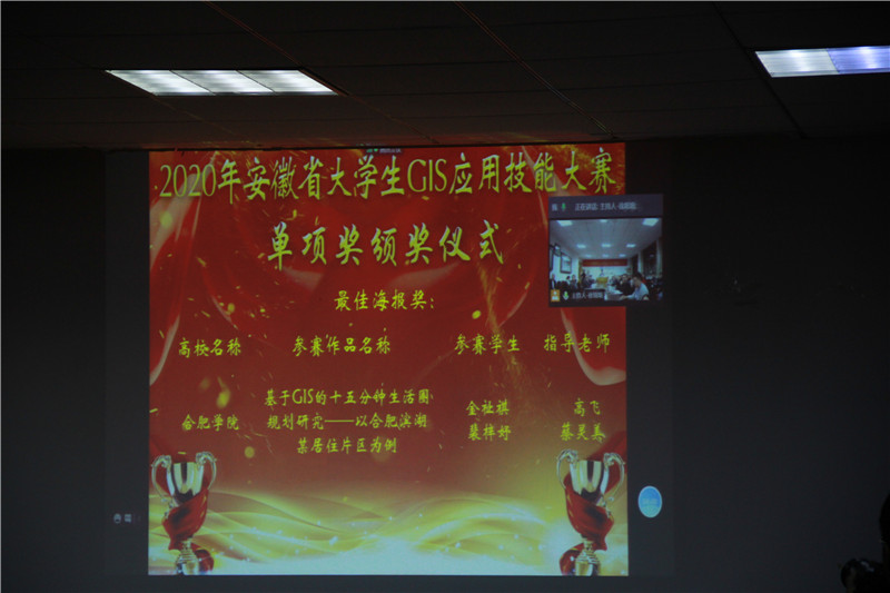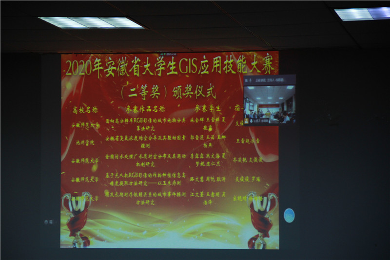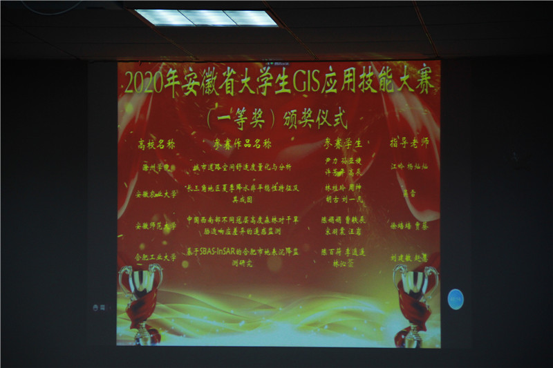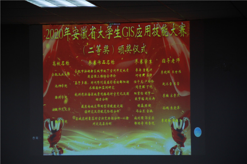 、池州学院等八所高校的23组参赛作品获得二等奖;另有35组参赛作品获得三等奖;齐凌艳、江岭等一等奖队伍的指导教师获得优秀指导教师奖;安徽大学的《水位调控下菜子湖湿地景观动态遥感监控》获得最佳答辩奖;合肥学院的《基于GIS的十五分钟生活圈规划研究--以合肥滨湖某居住片区为例》获得最佳海报奖;皖西学院的《基于GIS的安徽省非物质文化遗产的空间分布特征研究》获得最佳协作奖。