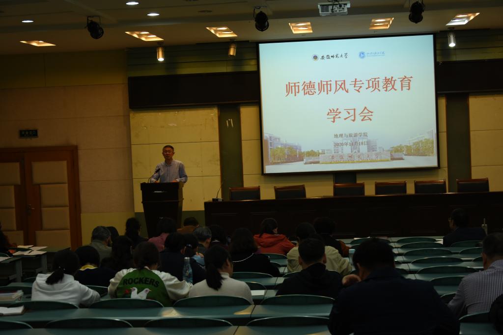 在实验楼101报告厅开展师德师风专项教育学习会,由贾冠忠书记主持,学院全体教职工参与本次的学习。