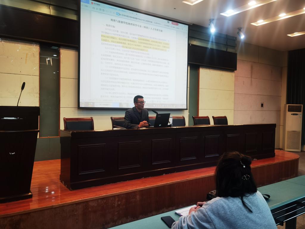 地理科学专业(师范)人才培养方案》。首先,朱老师介绍了师范类专业培养目标:师范类专业以培养具有高尚的师德师风、浓厚的教育情怀、扎实的学科知识和实践能力,优良的教学和教研能力,较强的班级管理和综合育人能力过硬的自我发展能力,具备卓越教师潜质,胜任中学地理教学教研和管理工作的优秀专业型人才、具有科学研究能力的高素质创新型人才为目标。随后,朱永恒老师详细介绍了在中学从教五年后应具有的教师专业素养和职业成就,希望同学们四年学有所为,实现理想,实现目标,同时,朱永恒老师以不同年级同学们的座谈会的反馈,对同学们做出了详细的专业解释,对同学们提出了师德规范教育情怀,学科素养,教学能力,班级指导,学会反思沟通合作,七大毕业要求,并强调了师德规范的重要性,教育见习和野外实习的必要性,并对同学们详细解释,学制与毕业学分,就核心课程进行分析简介,解释了课时安排和学分安排,强调专业课学习,并再次强调综合发展介绍,专业选修课程,拓展学生知识面,总结各项要求,支撑着大家的成人成才之路,并就各项课程,如何支撑进行解读,同学们兴趣浓厚反应强烈。