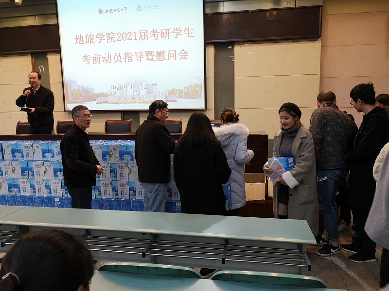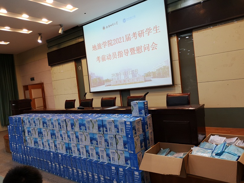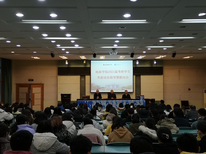 2021届考研学生考前动员指导暨慰问会。院党委书记贾冠忠、院长苏勤、院党委副书记乔静、2017级辅导员全体辅导员以及2021届考研学生参加了动员慰问会。会议由院党委副书记乔静主持。