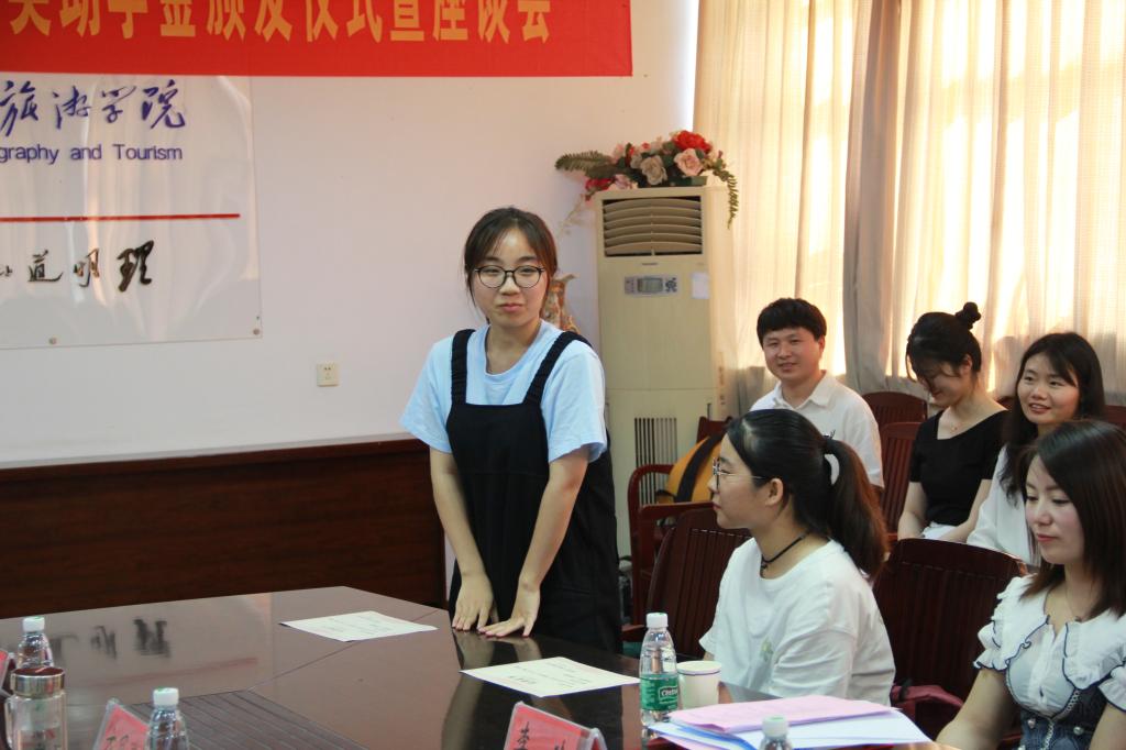 2017级地理科学罗勇、2018级地理科学(师范)杨帆、2018级旅游管理王欣悦、2020级地理科学类古丽加玛丽·提来克代表获奖受助学生汇报了自己在校期间学习工作情况,分享了自己的成长历程,并对刘明达先生的助学义举表示了感谢,并立志在以后的学习生活中,不忘来时路,把苦吃下去,把书读出来,脚踏实地,努力奋斗,成人成材,回报母校,服务社会,报效祖国。