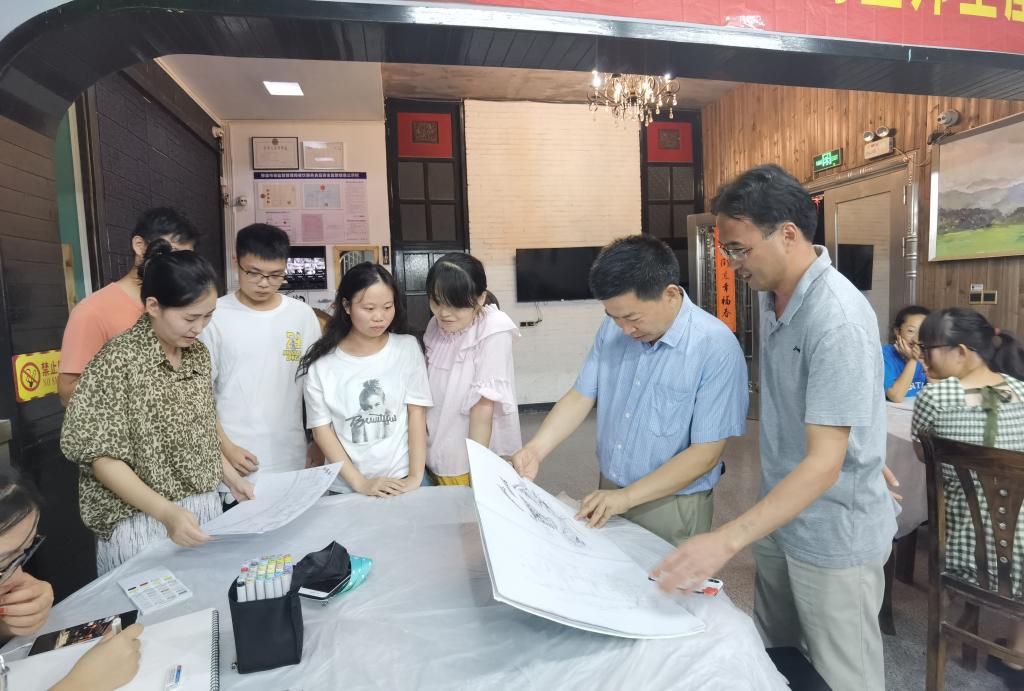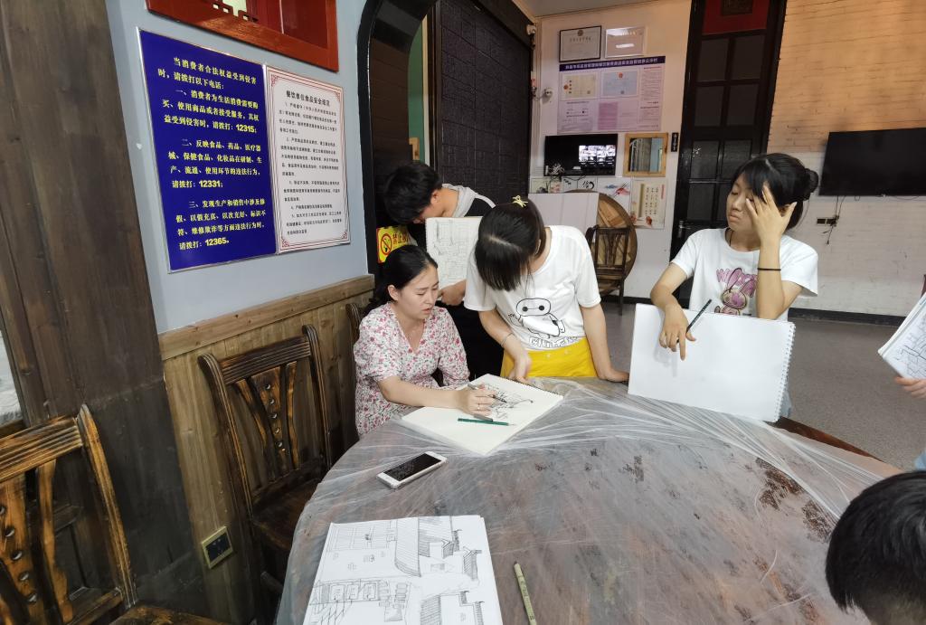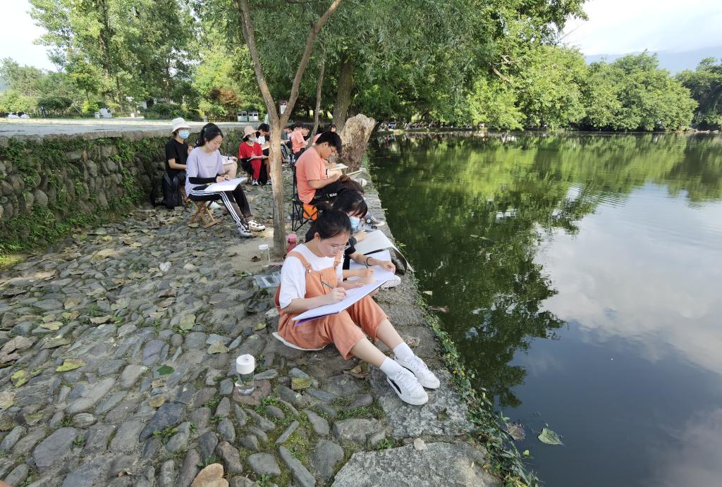 7月6日初到宏村,老师安排导游带领同学们从文化底蕴和自然风化的宏观层面把握宏村,产生一个总体了解和认识。接下来的几天里,同学们的画笔从南湖边描绘到村中街巷,从湖边绿荷、湖上石桥,刻画到粉墙黛瓦、精致牌坊……水墨江南画,逐渐从眼前,流转到笔下、到心里。每日晚餐后,同学们都会聚集在专业老师周围听取点评,了解自己的优点和不足,并在接下来的实习中不断通过练习进行强化。金莹莹也鼓励大家敢于下笔、勇于着色,在大胆尝试中摸索自己的绘画风格,放松线条,追求进步。