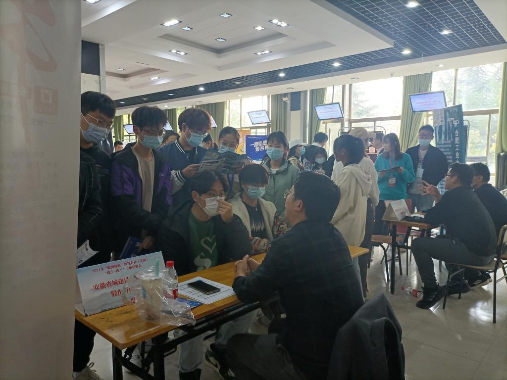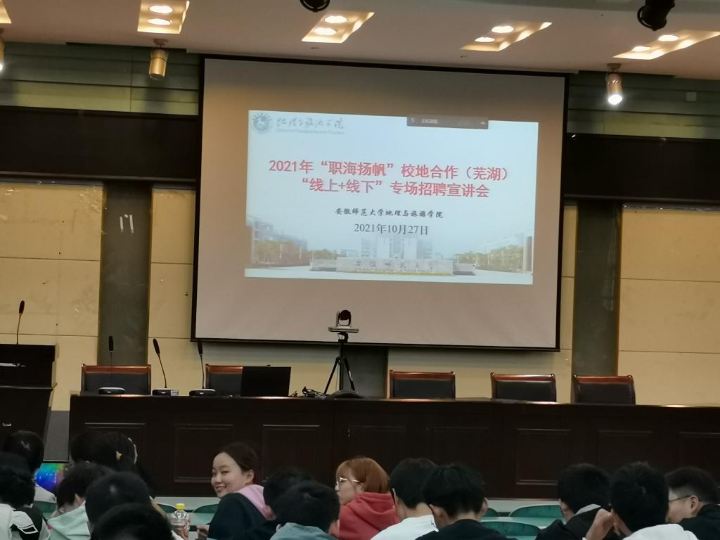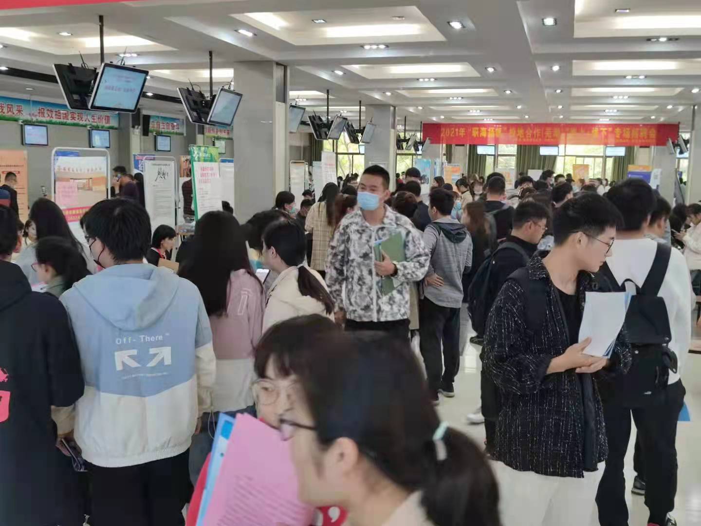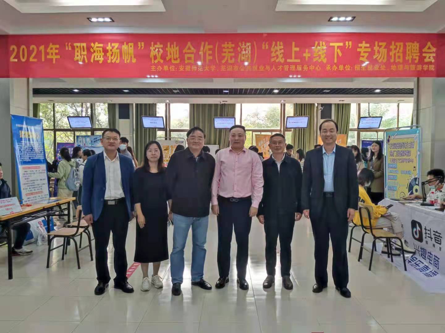 2021年“职海扬帆”校地合作(芜湖)“线上+线下”专场招聘会成功举办。来自京沪苏浙皖等地的科大讯飞、海螺集团、国美电器集团等世界和中国500强企业,以及安徽省旅游规划设计研究院、安徽省城建设计研究总院、安吉县教育局等119家优质企事业单位应邀参会,其中线下招聘单位60家,1100多个招聘岗位涉及文化、教育、设计、科技等多个门类。招聘会现场和线上招聘平台吸引了全校毕业生的到来。