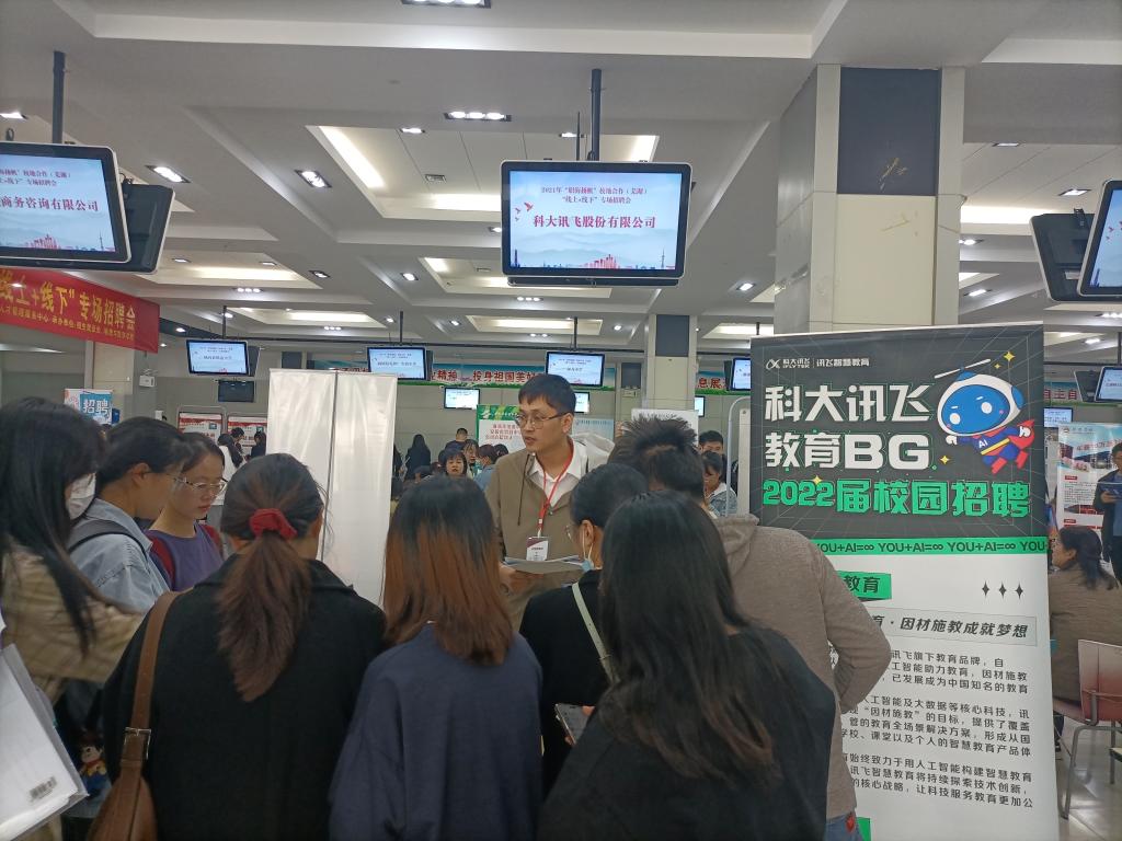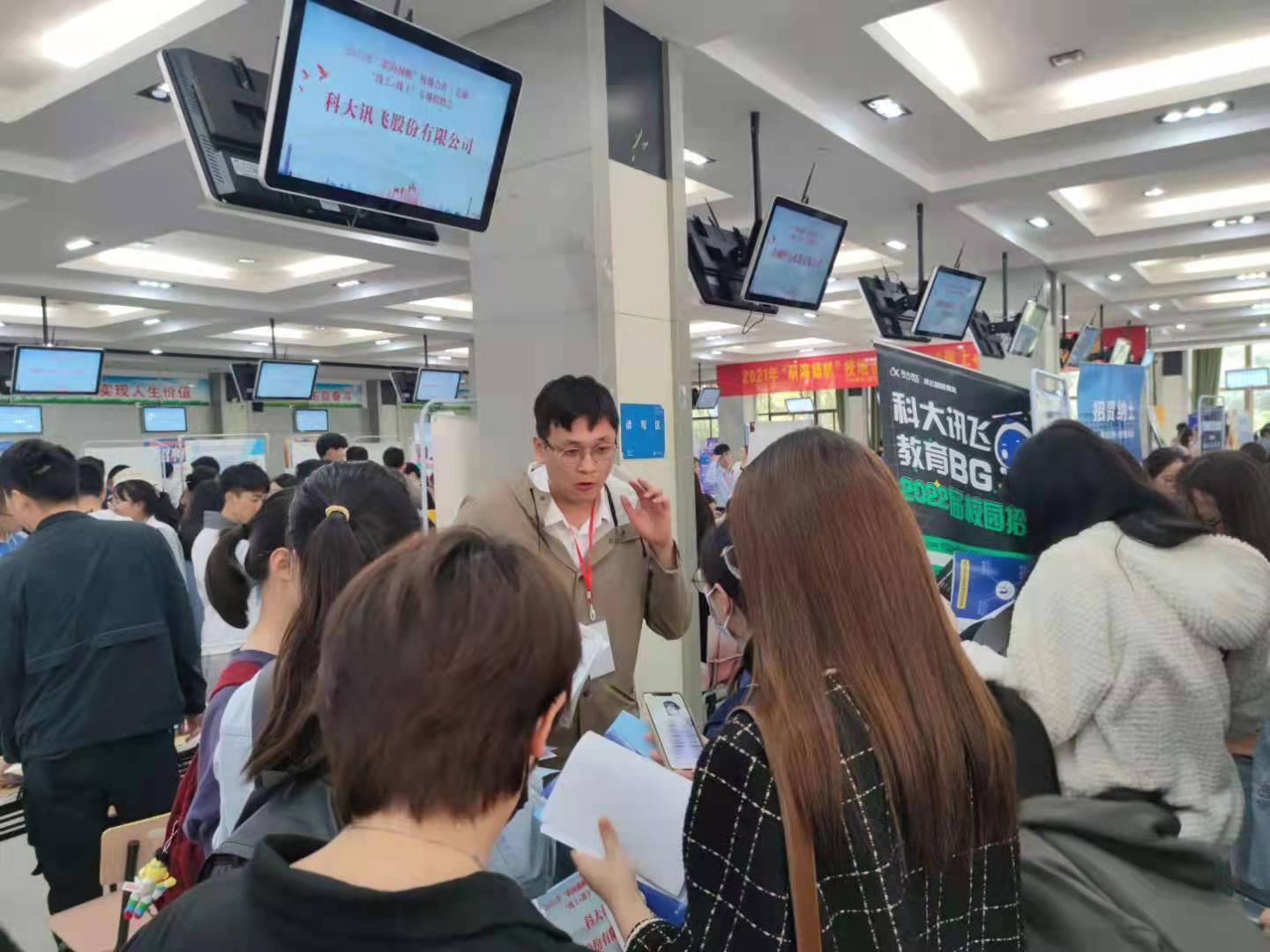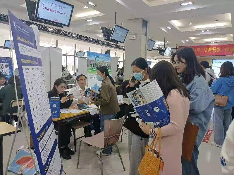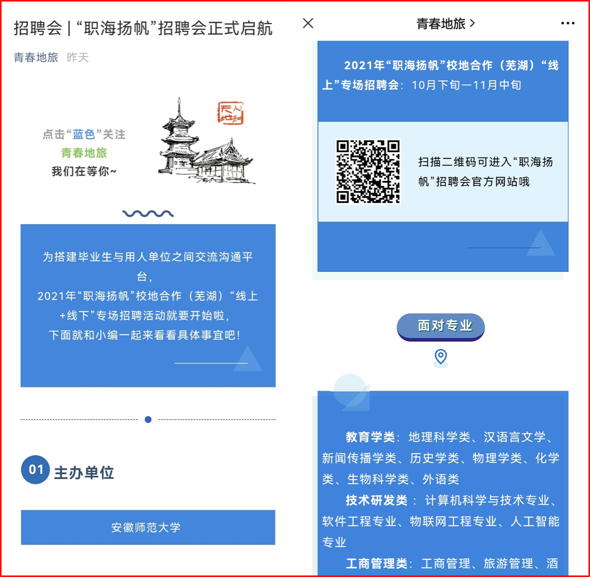 2021年“职海扬帆”校地合作(芜湖)“线上+线下”专场招聘会成功举办。来自京沪苏浙皖等地的科大讯飞、海螺集团、国美电器集团等世界和中国500强企业,以及安徽省旅游规划设计研究院、安徽省城建设计研究总院、安吉县教育局等119家优质企事业单位应邀参会,其中线下招聘单位60家,1100多个招聘岗位涉及文化、教育、设计、科技等多个门类。招聘会现场和线上招聘平台吸引了全校毕业生的到来。