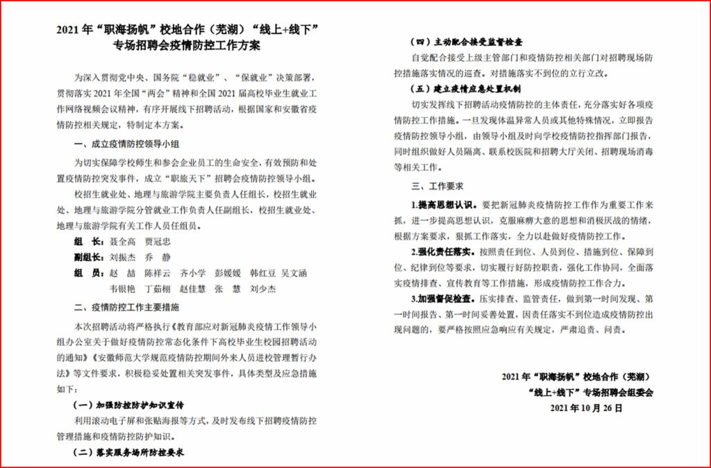 为有效应对国内局部地区疫情反弹带来的风险,有序开展线下招聘活动,根据国家、安徽省和学校疫情防控相关规定、突发事件应对有关法律法规,招聘会组委会制定了疫情防控工作方案,成立“职海扬帆”招聘会疫情防控和安全处置领导小组,加强防控防护知识宣传,落实服务场所防控要求,强化招聘现场防控管理,建立突发事件应急处置机制。特别是在招聘会召开前后,安排工作人员对招聘大厅、扶梯、洗手间等公共区域和招聘展位台面、公共桌椅、展板等进行消毒,配备额温仪和消毒用品,招聘会大厅出入口设置监测岗,采用“安康码绿码+佩戴口罩+测量体温”方式对进场人员进行核验,切实维护参会人员生命财产安全,确保招聘活动顺利、平稳。