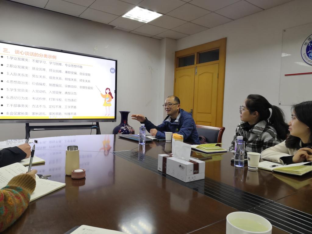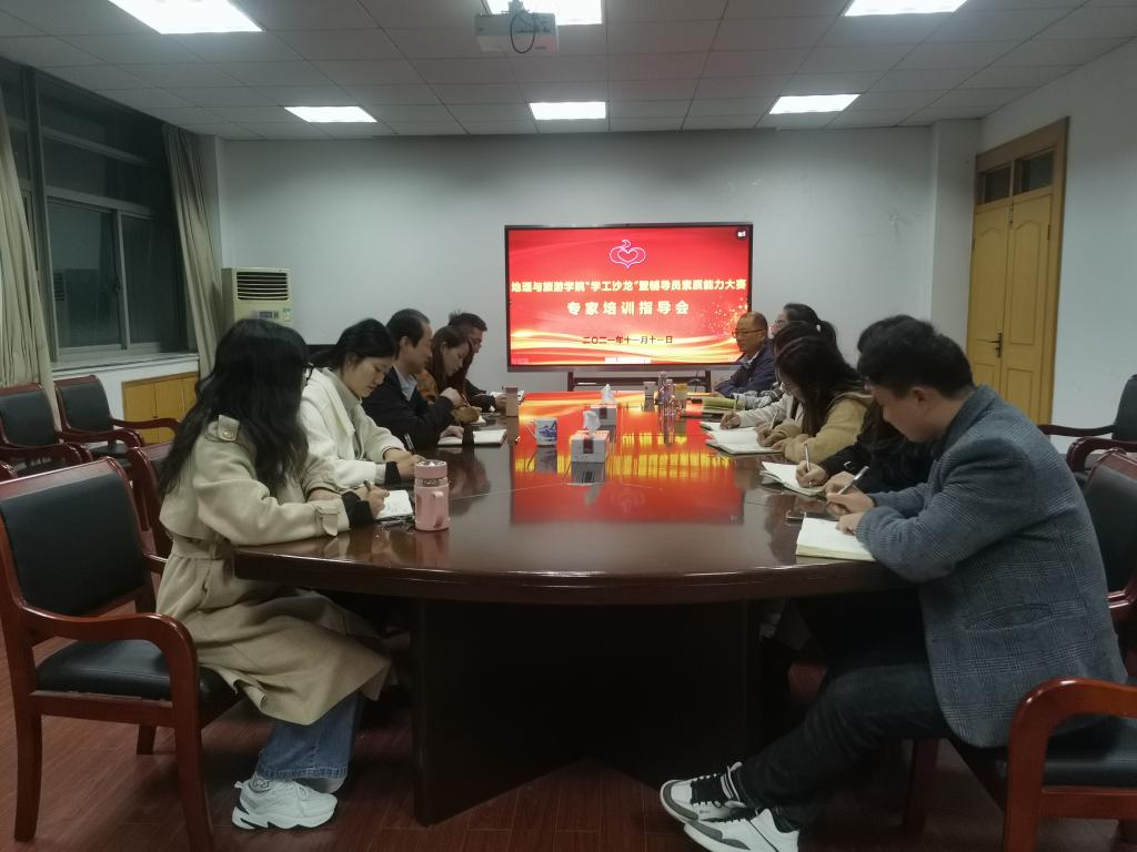 在学院行政楼四楼会议室举行辅导员素质能力提升计划暨“地旅学工沙龙”活动,邀请学校副处级辅导员宫超老师进行辅导员素质能力大赛专题培训指导,全体专兼职辅导员参加培训。培训由学院党委副书记乔静主持。