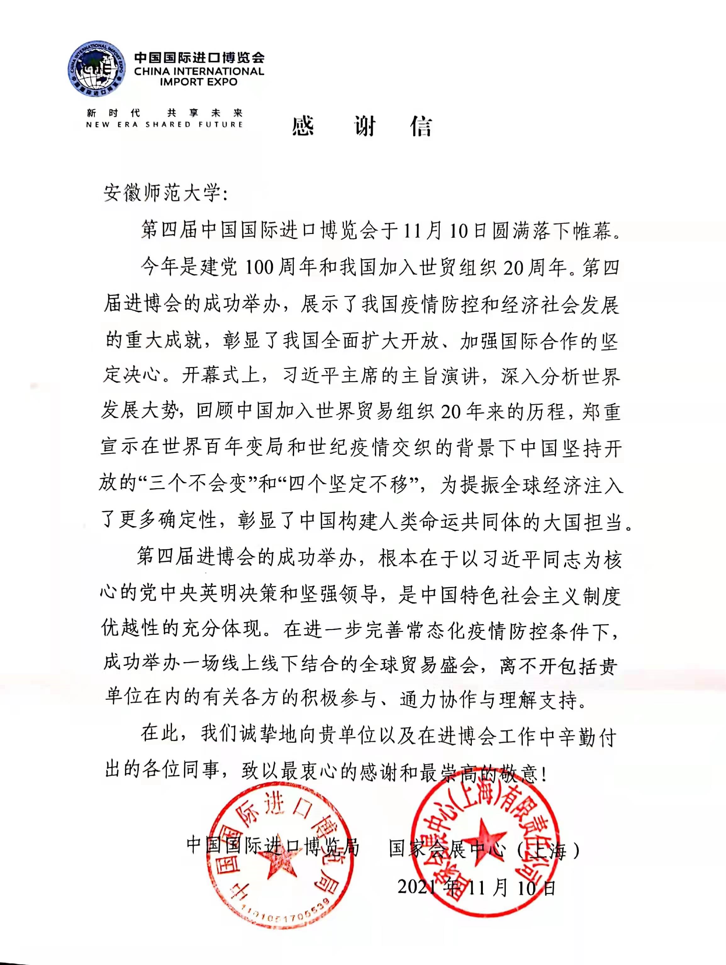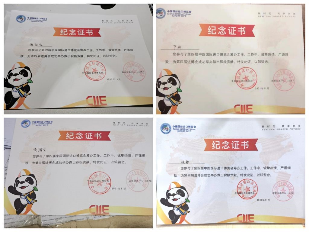 对第四届国际进口博览会的大力支持以及表扬和鼓励各位同学们在进博会期间的优异表现,中国国际进口博览总局、国家会展中心(上海)向学校发来感谢信,信中写到“在进一步完善常态化疫情防控条件下,成功举办一场线下线上结合的全球贸易盛会,离不开包括贵单位在内的有关各方积极参与、通力协作与理解支持。在此,我们诚挚地向贵单位以及在进博会工作中辛勤付出的各位同事,致以最衷心的感谢和最崇高的敬意!”另外,国家会展中心上海洲际酒店总经理贺纪斯先生为了感谢同学们在进博会期间所作出的贡献,为同学们颁发了证书和进博会文创产品。