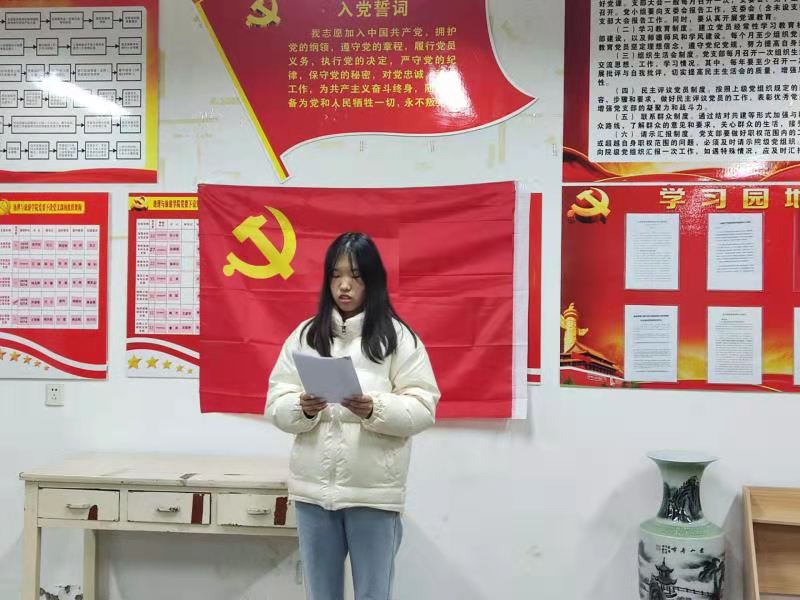 首先,陈童歆和朱文婧同学分别宣读了自己的《入党申请书》,并向韩红豆汇报了自己的基本情况、对党的认识以及入党动机。其中,朱文婧同学提到正是在父亲潜移默化的影响下,才逐渐坚定了入党的信念。她深情地说到“在2019年夏天安徽淮北发生城市内涝时,父亲身为一名党员,以身作则,不畏艰险积极帮助街坊邻里抵御倒灌洪水的行动深深深深感染了自己,从而更加坚定了加入中国共产党的决心”。随后,韩红豆对两位同学的入党积极性表示肯定和鼓励,并建议两位同学要积极认真学习党的基本理论知识,自觉学习习近平新时代中国特色社会主义思想,不断增强“四个意识”,坚定“四个自信”,自觉做到“两个维护”,认真学习习近平总书记“七一”重要讲话精神以及党的十九届六中全会精神,以实际行动践行初心,积极发挥示范引领作用,不断向党组织靠拢,争取早日入党。
