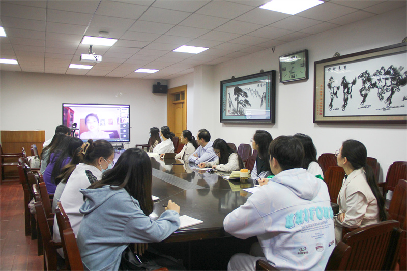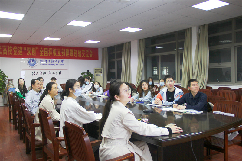 党委副书记乔静,团委书记陈祥云,辅导员韦银艳,2017届地理科学专业毕业生优秀选调生代表周男以及报考选调生、公务员的学生代表们线上、线下参加会议。会议由毕业班辅导员彭媛媛主持。