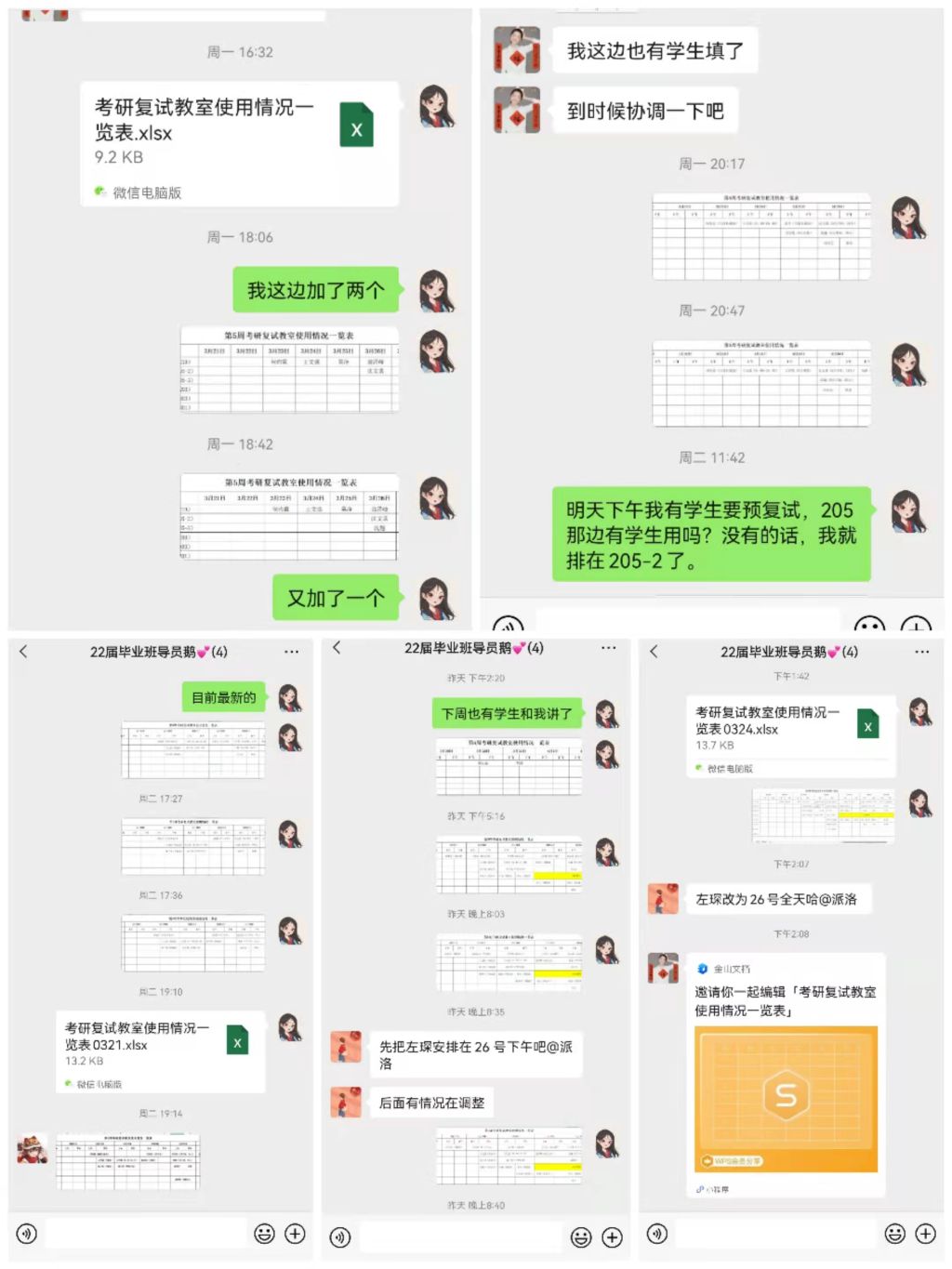 完成了6间考研复试教室的调配并投入使用,临近周末,线上复试需求增多,不仅新增了2间备用教室,帮扶老师和毕业班辅导员也纷纷表示可以将自己的办公室提供给学生,全院同步协商稳步推进考研学子预复试及正式复试工作。