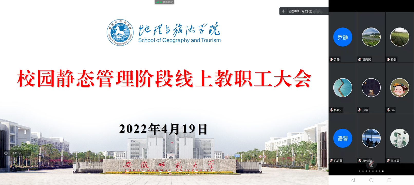 4月17日晚上,学院在行政楼四楼会议室召开辅导员工作紧急会议,分析研判疫情防控形势,传达布置校园疫情防控和和学生教育管理相关工作。会议指出,此次疫情病毒有具隐匿性强、传播速度快等特点,给防控工作带来极大挑战,学校是人员高度集中的场所,不容有任何闪失,要牢固树立学生健康安全压倒一切的理念,不能有任何松劲心态、懈怠心理,做到尽锐出战、以快制快,辅导员全部要下沉一线全力抗疫,切实解决学生在学习、生活等方面存在的困难和问题,千方百计打赢这次疫情防控阻击战。4月19日晚,学院召开线上教职工大会,院党委书记贾冠忠、院长方凤满围绕校园静态管理下疫情防控、安全稳定、教学科研、学生管理、就业帮扶等工作做了重点部署,要求广大教职工提高政治站位,严明疫情防控工作纪律,严格遵守疫情防控各项规定,做到心态不乱、工作不断,为打赢疫情防控阻击战歼灭战做出积极贡献。
