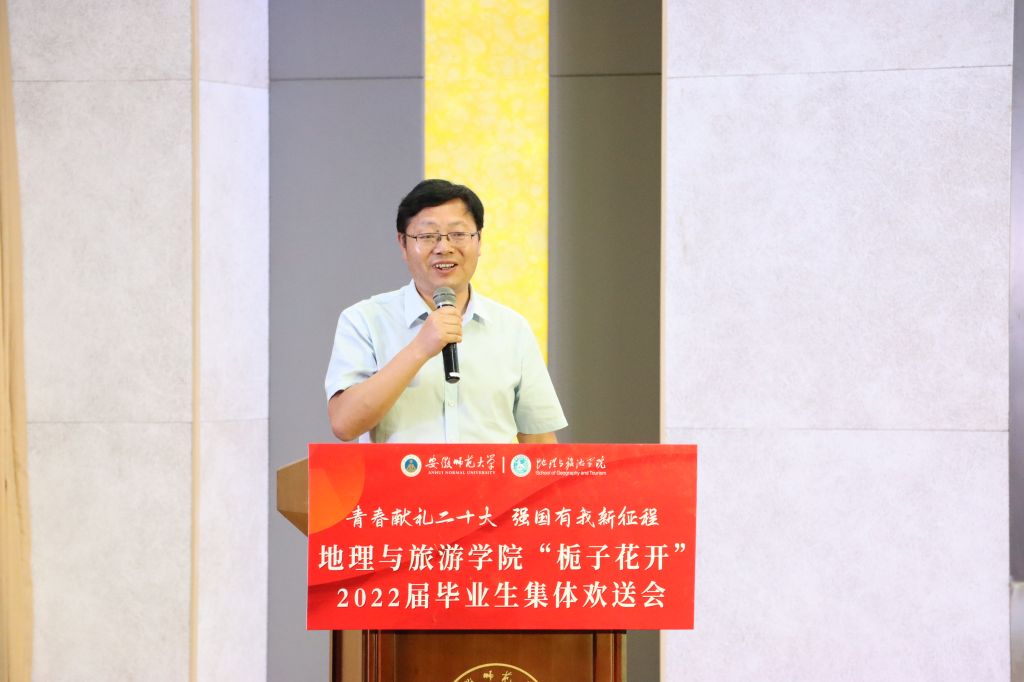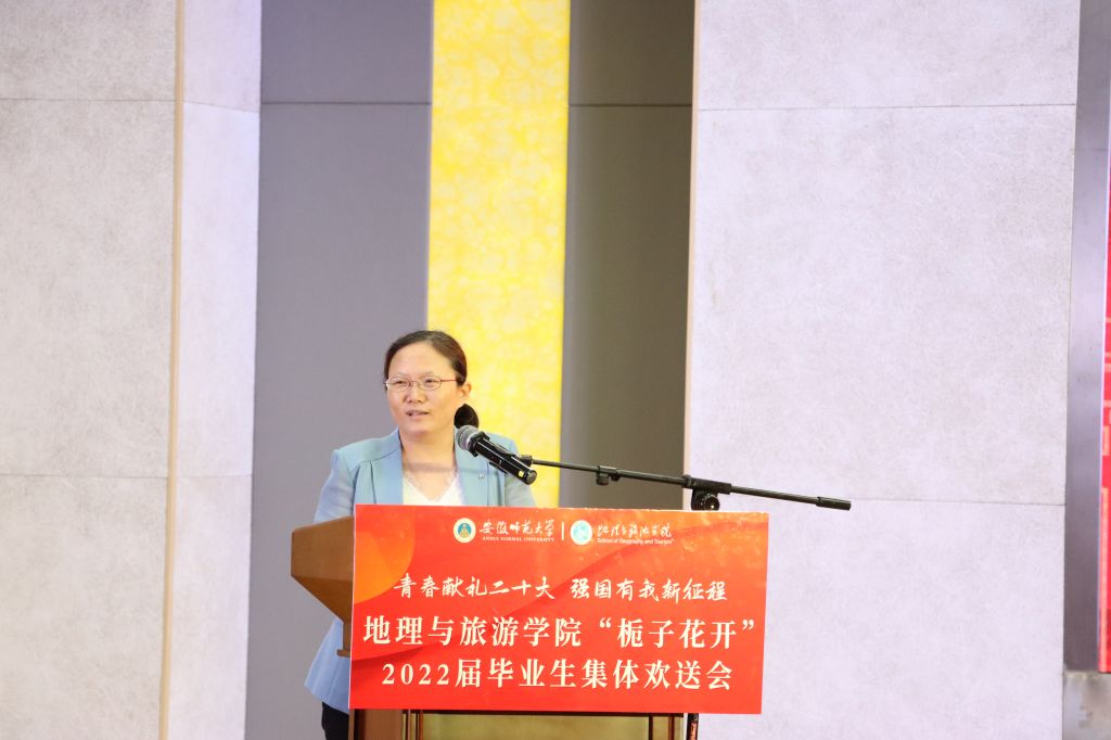 院长方凤满教授代表学院致辞。她代表全体师生员工,向即将开启新征程的395名本科毕业生、112名硕士毕业生和4名博士毕业生,表示热烈的祝贺和诚挚的祝福,深情回顾了学院成立70年来,一代又一代地旅人始终与党和国家同心、同向、同行,初心不改、奋斗不息的辉煌历程。她表示,师大这片温暖土地承载了全体毕业生精彩纷呈的青春光景,学院的每一次收获和荣光离不开包括2022届毕业生在内的全体地旅人的埋头苦干、开拓进取。临别之际,作为师长,她送给毕业生三句话:一是面对纷繁复杂的发展环境,需要筑牢理想信念根基,在品德修为上下功夫;二是面对日新月异的发展需要,需要树立终身学习观念,在综合能力上下功夫;三是面对新时代新征程,需要胸怀“国之大者”,在担当奋斗上下功夫。希望大家带着全体老师们的嘱托和祝福,踏上新的征程、不负韶华、只争朝夕、前程似锦,牢记健康第一,记得常回家看看!