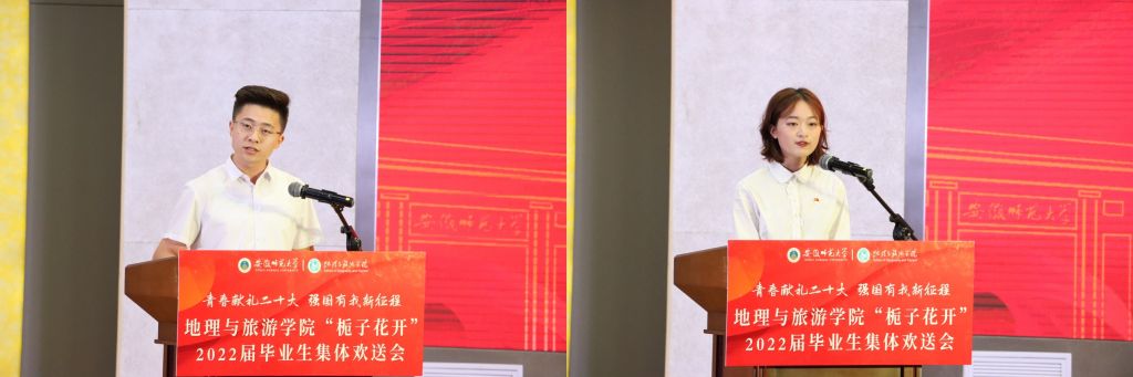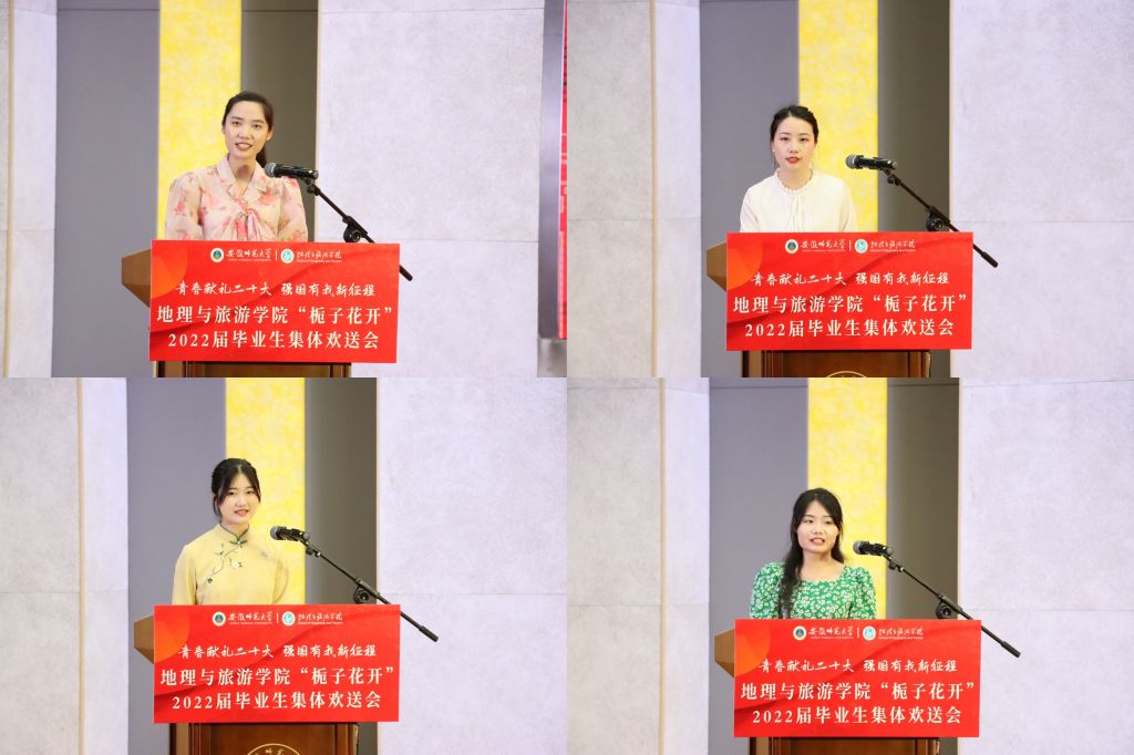“十年树木,百年树人”,老师们严厉的谆谆教诲后蕴藏着殷殷深情。欢送会上,毕业班辅导员为毕业生送上临别寄语。2018级旅游管理、酒店管理、土地资源管理专业辅导员陈祥云深情回忆了与同学们朝夕相处的点点滴滴,希望大家永远保持热爱、奔赴山海,在热爱祖国、热爱生活、热爱自己中遇见更好的自己。2018级地理信息科学专业辅导员彭媛媛细数了两年来从实习、考研到就业的过程中,与同学们逐渐加深的感情、逐渐增加的信任,勉励大家保持善良、坚持奋斗、放平心态,不汲汲于名利,不戚戚于平淡,心怀梦想,顽强生长。2018级地理科学(师范)专业辅导员丁茹栩以“感恩”“传承”“期待”三个关键词,回顾了自己作为辅导员的经历和路程,希望同学们始终抱有爱国爱民的情怀、锤炼砥砺奋斗的品格、笃定实学实干的步伐,祝福大家奔赴星辰大海,开启新的人数精彩。2018级地理科学(非师范)、城乡规划专业辅导员张慧通过温情的话语、温暖的日常,讲述了与同学们相遇相识相知的时光,总结了与同学们一起经历过的岁月、奋斗过的时光,希望大家保持一个赤诚、学习的心,做一个有理想有抱负、活到老学到老的人。