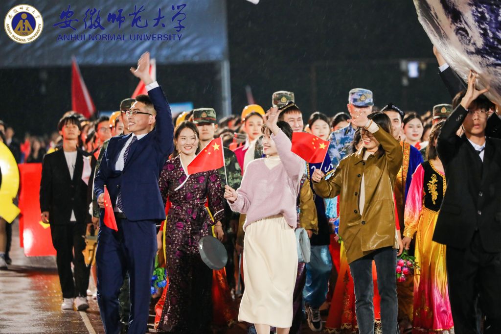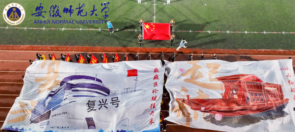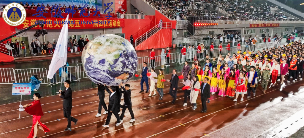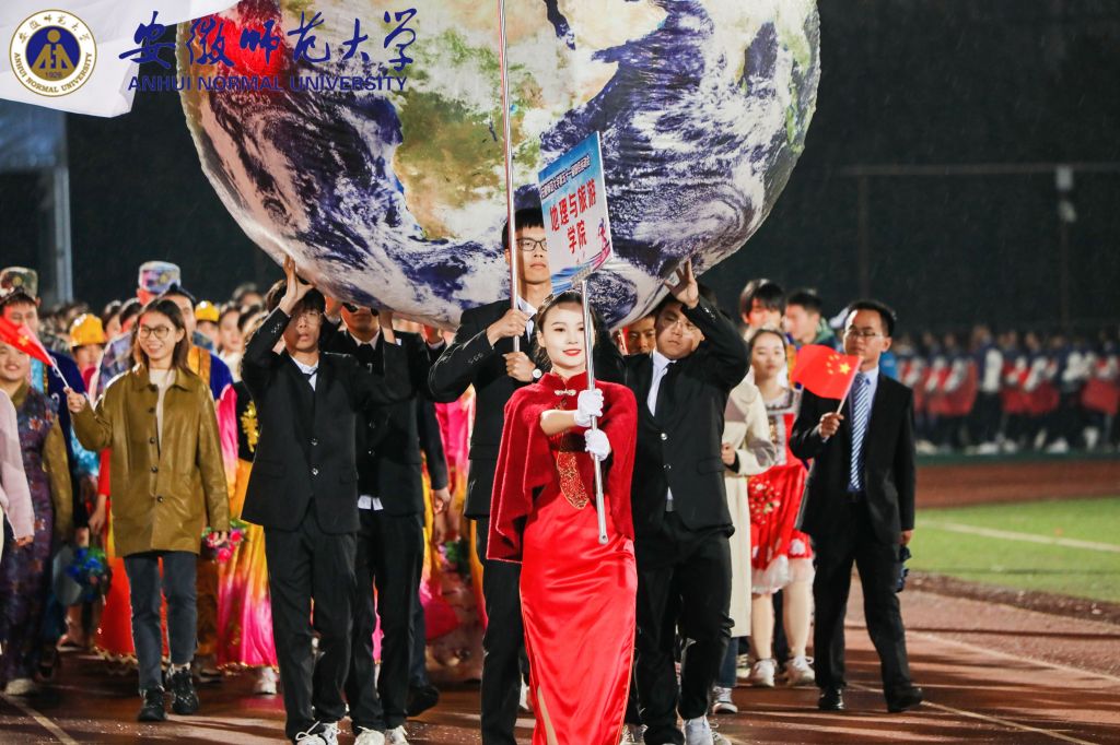 作为学院方阵率先入场,步伐坚定,气势如虹,激情豪迈,以热情饱满的姿态向全校师生展示地旅学子昂扬向上的精神风貌。“经天纬地,弘道明理,青春向党,勇毅前行!”响彻全场的口号昭示着地旅必胜的决心。富有专业特色的荧光地球被高高举起;身着绚丽服饰的少数民族同学别具一格,围成一圈载歌载舞,彰显了民族团结的和谐气象;礼仪队身着红色旗袍流转光华,退伍学生身披绿色军装英姿飒爽。主席台前,地旅学子以鲜艳的展板,流动的巨幕献礼二十大,一幅图卷徐徐展开,一艘红船在穿越历史沧桑巨变后终成巍巍巨轮的壮阔历程跃然于纸上,体现了地旅学子始终坚定理想初心,付绚丽韶华汇入新时代的浪潮,永远跟党走,奋进新征程,以饱满自信的精神面貌做出“青春奋斗,强国有我”的承诺,彰显了新时代青年的使命担当。