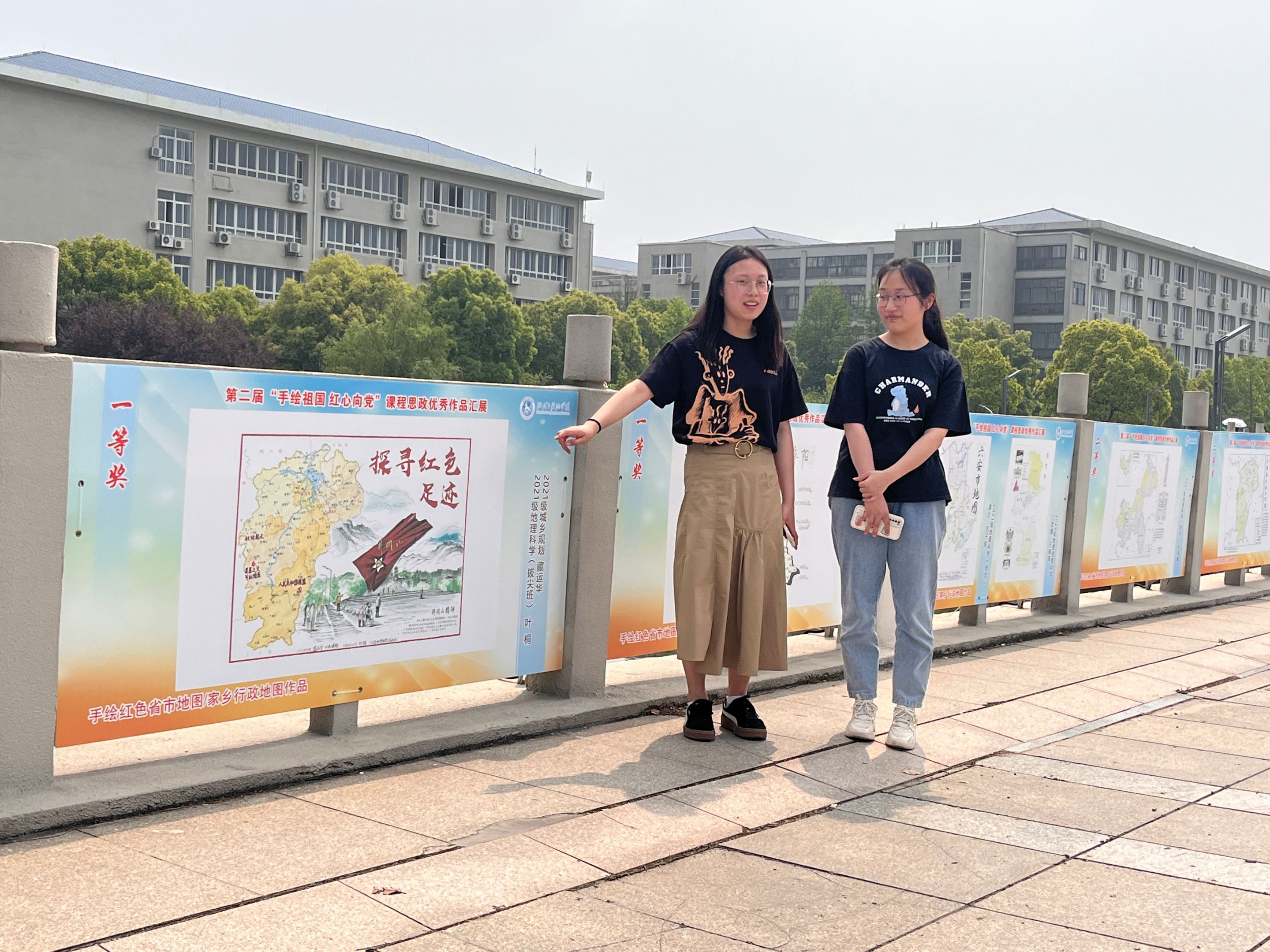 专业特色,举办了第二届“手绘祖国 红心向党”课程思政手绘地图征集活动,并于学校九曲桥开展了优秀作品汇展暨知识竞答活动。