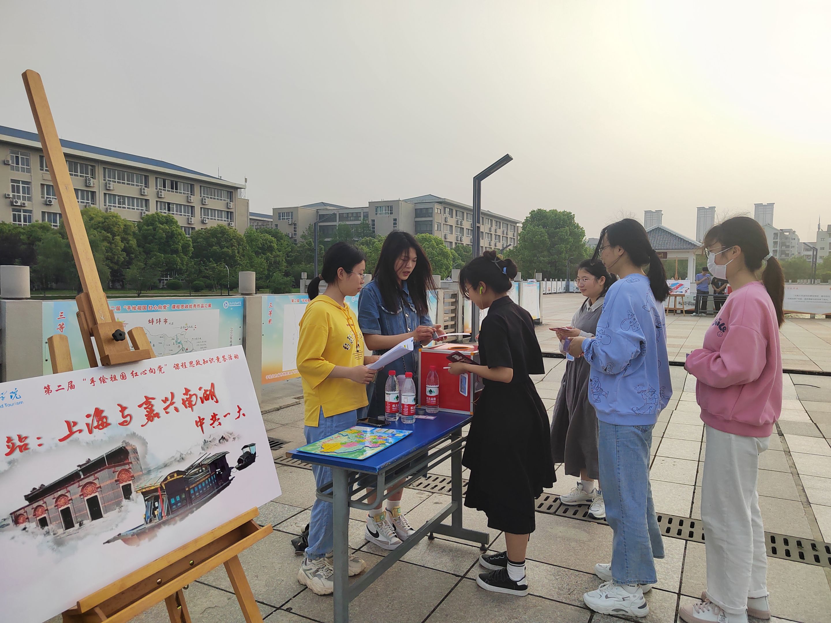 在作品汇展的同时,活动现场还设计了二十大主题知识问答通关环节,沿着作品参观路线依据“中国五大革命圣地”分别设置5个打卡站点——“第一站:上海与嘉兴南湖”、“第二站:井冈山”、“第三站:遵义”、“第四站:延安”、“第五站:西柏坡”,参与学生依次到达相应站点抽取题库进行知识竞答,顺利通关后即可领取番茄小说