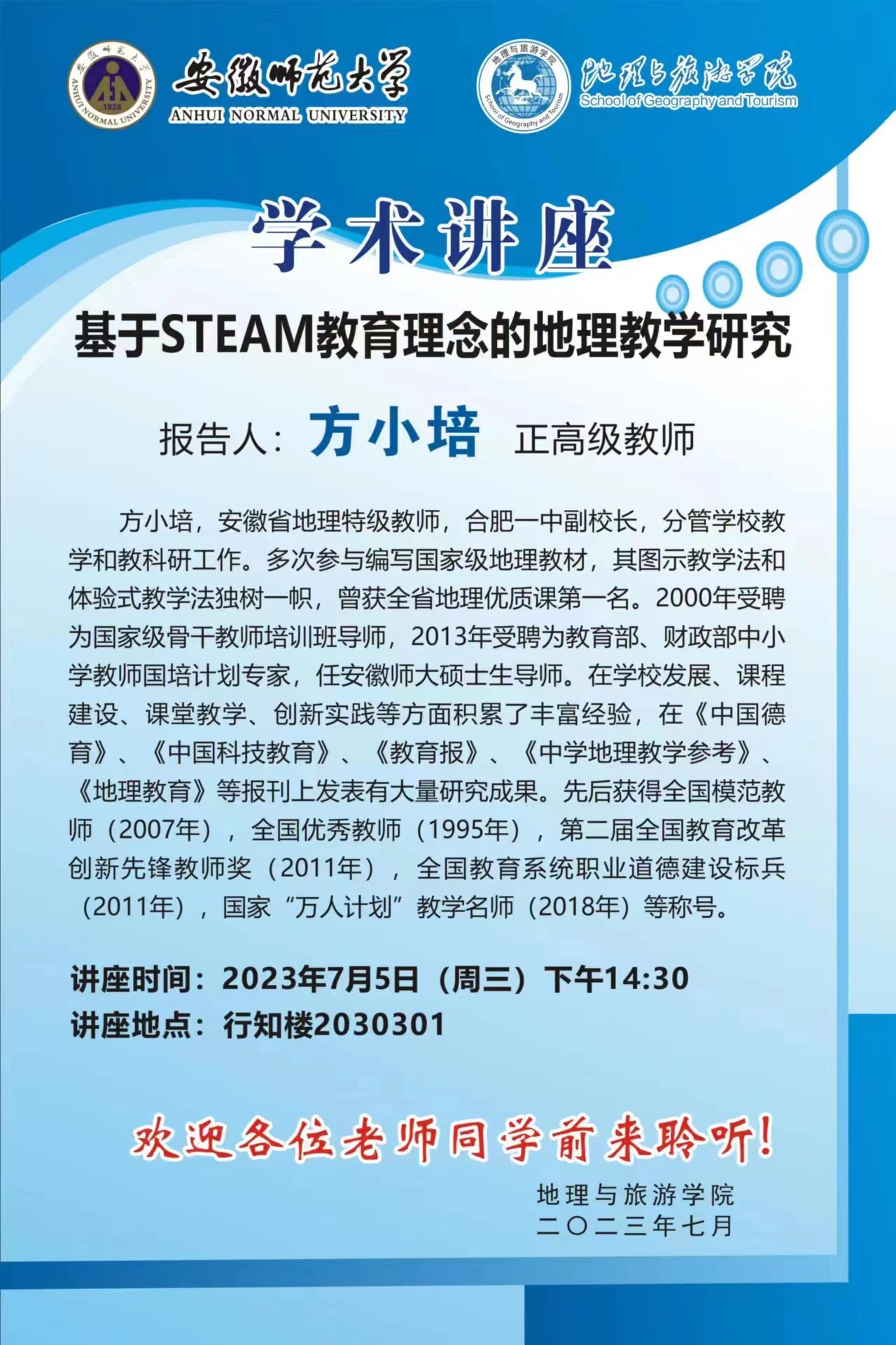 暑期小学期“名师面对面”邀请国家“万人计划”教学名师方小培作题为《基于STEAM教育理念的地理教学研究》学术报告,学院地理专业教师及暑期小学期学员代表参加会议。本次会议由地理科学专业负责人朱永恒主持。
