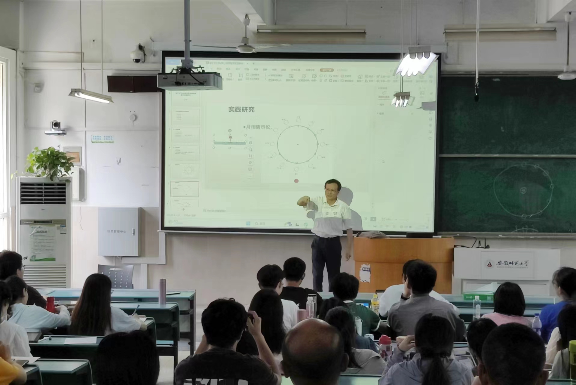 随后方小培以月相研究为案例,逐步解析如何选题,并在实践研究环节引导参会师生使用A4纸逐步完成月相演示仪的制作,同时通过与同学们互动进一步阐述该实验所蕴含的地理知识。此外,他还分享了一系列实践研究和小组合作等地理教学实践案例,总结了基于STEAM教育理念的地理教学研究的重要意义,并鼓励同学们在今后教学中要富有行动力和创造力,敢于创新和勇于尝试。
