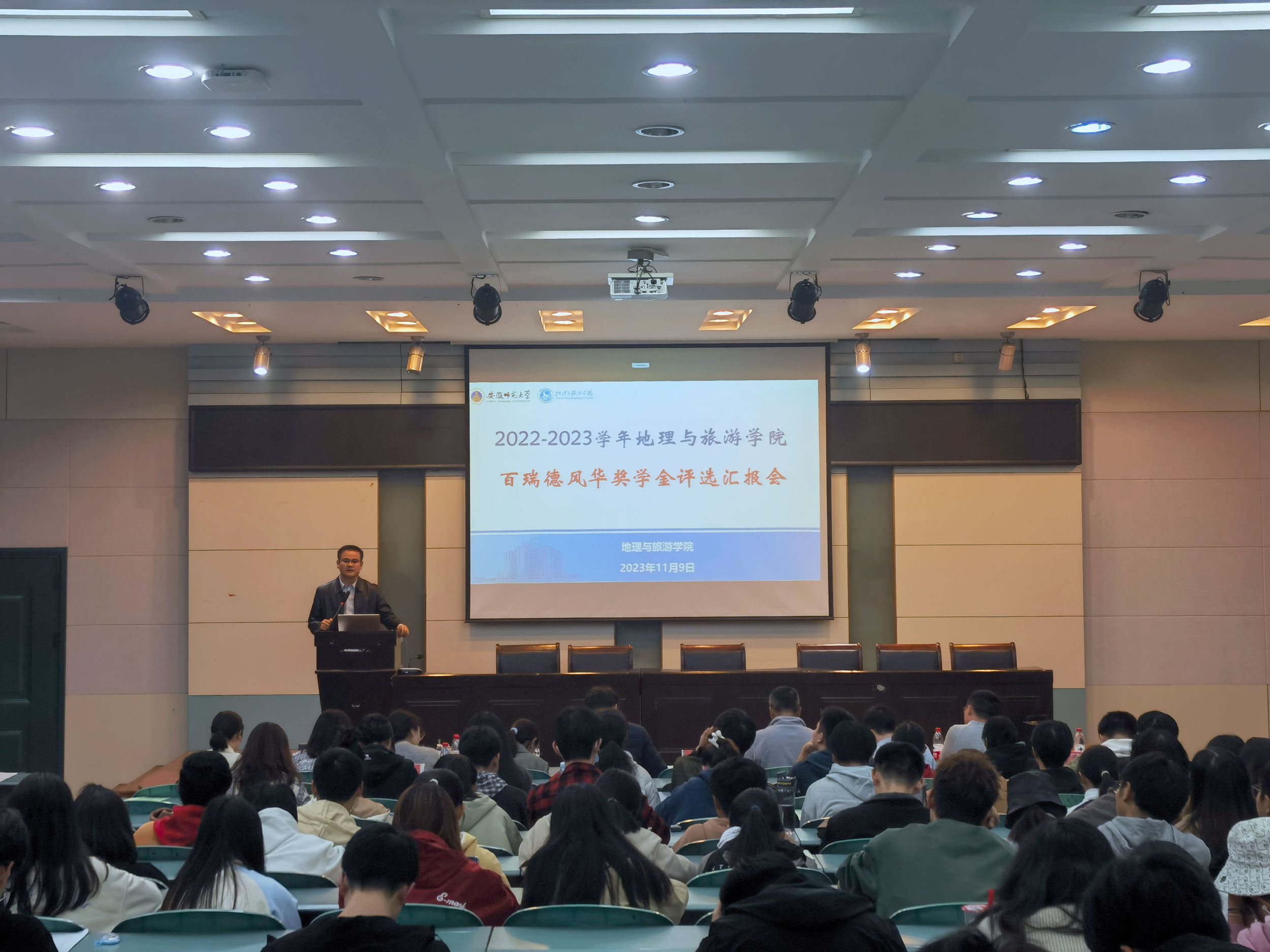 在学院实验楼101报告厅举行百瑞德风华奖学金暨“十佳学生骨干”评比汇报会,学院党委副书记付勇、地理科学专业教师杨立辉、旅游管理专业教师阮陵、地理信息科学专业教师徐培培、土地资源管理专业负责人费罗成、城乡规划专业教师黄秋实以及学院团委负责人和专兼职辅导员代表出席此次活动并担任评委。会议由2022级地理科学(师范)专业李钰莹同学主持。