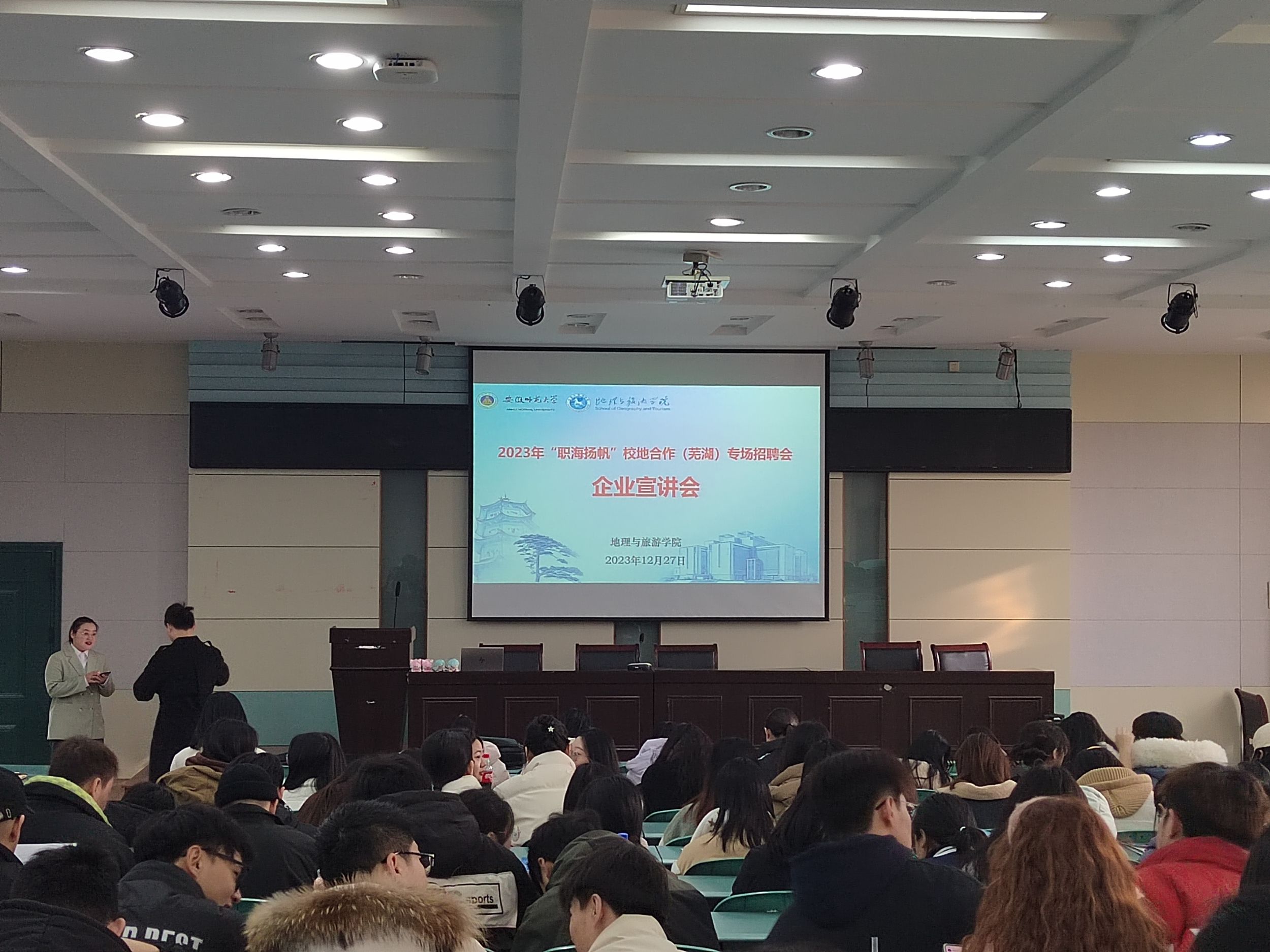 为充分发挥校友资源,深化朋辈教育引领就业,旅游管理专业邀请杭州博行达观文化发展有限公司总经理张松、芜湖汉爵阳明大酒店总经理年磊、安徽大美国际旅行社有限公司总经理邢之鹏三位2011届旅游管理专业校友、现任开元森泊度假区招聘专员的2022届刘浩桐、2023届程杨两位校友前来开展招聘宣讲。校友们结合自身创业、就业经历,向同学们介绍了未来职业发展的可能性和需要思考的问题,同时积极宣传本单位招聘岗位,鼓励毕业生们积极加入。