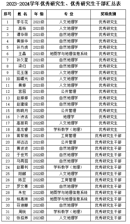 根据《关于做好2023-2024学年研究生先进个人评选工作的通知》(校研工部〔20243号)等文件精神和要求,学院在坚持公开、公正、公平原则的基础上,通过本人申请、民主评议、研究生工作办公室提出初步人选、学院审核推荐等程序,现确定学院2023-2024学年优秀研究生及优秀研究生干部拟推荐名单现公示如下: