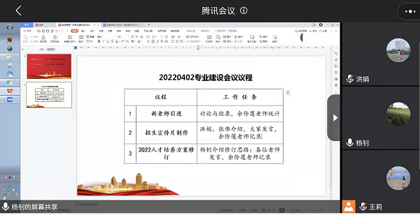 为加快一流本科专业建设,进一步提高旅游管理人才培养质量,42午,旅游教研室召开了国家级一流本科专业建设研讨会。鉴于目前疫情防控形势严峻,会议采用腾讯视频会议的形式进行。全体旅游专业老师参加了会议会议由旅游教研室主任杨钊主持。