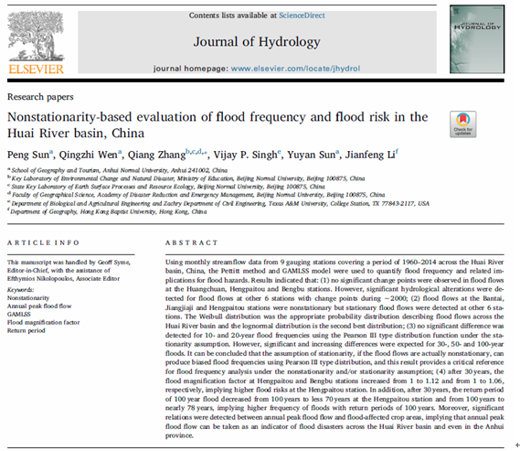 孙鹏副教授与北京师范大学减灾与应急管理学院、美国德克萨斯农大大学、香港浸会大学等合作开展的基于非平稳性的洪水风险研究,取得重要研究进展,其最新研究成果已在土木工程、水文、水资源领域历史最悠久、最有影响力的国际期刊《Journal of Hydrology》发表(IF:3.73,JCR 1区)。论文第一作者为孙鹏,通讯作者为北京师范大学张强教授。该研究得到国家自然科学基金创新研究群体项目(41621061)、国家自然科学基金项目(41601023,41771536)、国家杰出青年科学基金项目(51425903)、地表过程与资源生态国家重点实验室开放基金资助项目(2017-KF-04)等联合资助。