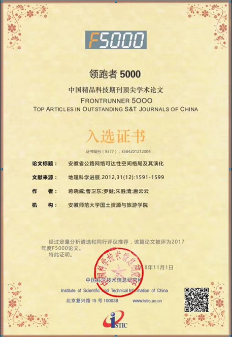 (原国土资源与旅游学院)曹卫东教授及其研究生蒋晓威、罗健、朱胜清、唐云云等作者于2012年12月份发表在地理科学进展上的论文“安徽省公路网络可达性空间格局及其演化”,经过定量分析和同行评议推荐,该论文被评为2017年度F5000论文,入选“领跑者5000—中国精品科技期刊顶尖学术论文” 。