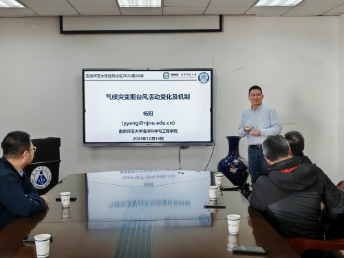 讲学,并做了题为《气候突变期台风活动变化及机制》的学术报告。报告在学院行政楼四楼会议室举行,学院相关专业的教师和研究生参加了此次报告。