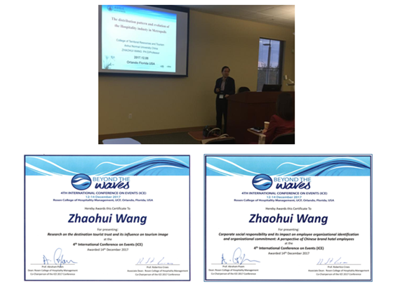 王朝辉教授研究团队应邀参加了“第二届中美旅游研究峰会”(2nd USA-China Tourism Research Summit and Industry Dialogue)和“第四届世界旅游与接待业研究峰会”(4th World Research Summit for Tourism and Hospitality)以及第四届国际事件会议(4th International Conference on Events),会议在美国佛罗里达州奥兰多市举行。