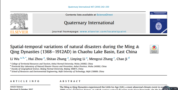 吴立副教授团队在国际知名地学期刊《Quaternary International》上发表最新研究成果“Spatial-temporal variations of natural disasters during the Ming & Qing Dynasties (1368-1912AD) in Chaohu Lake Basin, East China”。中国是典型的季风区,季风气候的不稳定性,导致中国气象灾害频繁发生,严重危害了国民经济和人民生命财产安全。地处中国东部北亚热带与暖温带湿润季风气候过渡区的巢湖流域在历史上水、旱、蝗、风、雪雹、地震等自然灾害频繁发生,已成为制约以合肥为中心的安徽省会都市圈社会经济持续发展的重要因素之一。过去对于巢湖流域历史自然灾害的研究,主要集中在对单一灾害或旱涝灾害的统计分析研究方面,而巢湖流域自然灾害的历史资料中,相对完整地记录着灾害发生时间和地点、灾害种类、受灾损失等情况。因此,通过将历史纯文字叙述描述量化,研究历史自然灾害的时空分布特征,对探讨当前灾害形成演化规律及防灾减灾措施具有重要的借鉴意义。该研究得到了国家自然科学基金项目(41771221,41401216)和中国科学院数字地球重点实验室开放基金项目(2015LDE012)的资助。论文第二作者、2017级硕士生周慧同学以及第三作者本科生张诗陶同学等参与了核心研究工作。