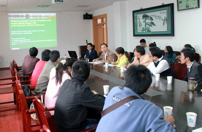 黄胜利博士结合自己的项目和科研成果,做了题为“Wetland Ecosystem Services Evaluation in the Prairie Pothole Regions, U.S.”(美国草原洼地区湿地生态服务评估)的学术报告。报告会上,黄胜利博士在介绍生态服务评估概念和研究区域背景的基础上,详细讲述了如何运用遥感与地理信息技术对湿地水量、水质、生物多样性和碳循环等进行模拟和评估。会后,黄胜利博士就与会教师和研究生提出的地理信息技术和科研模式等问题进行了深入的交流。
