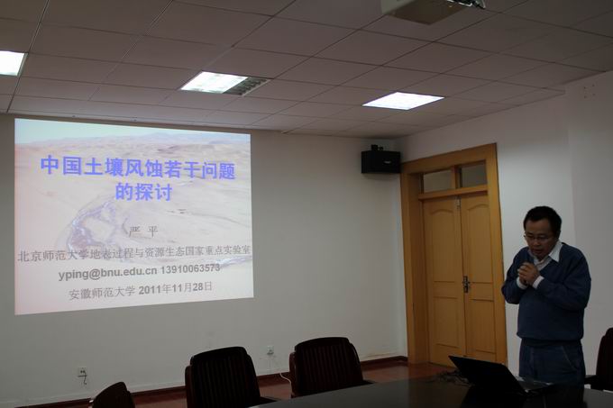邹学勇教授作了题为《中国荒漠化防治形势与任务》的报告,从宏观方面揭示了全球和我国土地荒漠化的现状、荒漠化引起的风沙灾害以及中国防治荒漠化的重点区域与技术路径。严平教授结合土壤侵蚀微观方面,作了关于《中国土壤风蚀若干问题的探讨》的学术报告,从土壤风蚀概况、目前的研究进展和相关问题的讨论三方面阐述土壤风化侵蚀的研究成果。两位教授新颖的报告内容、缜密的分析和平易近人的报告风格,使报告会不仅充满浓郁的学术氛围,而且保持着轻松的交流环境。