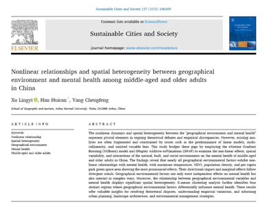 韩会然副教授团队在《Sustainable Cities and Society》(中科院一区Top,IF=10.5)发表了题为“Nonlinear relationships and spatial heterogeneity between geographical environment and mental health among middle-aged and older adults in China”的研究论文。论文第一作者为2021级硕士许岭怡同学,通讯作者为番茄小说