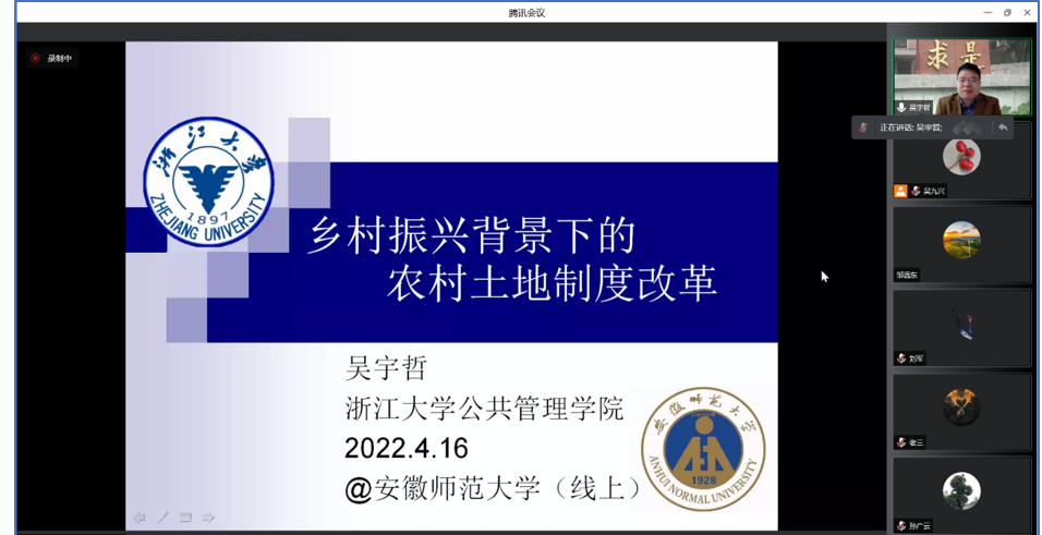 416日上午,浙江大学公共管理学院博士生导师吴宇哲教授应邀作了题为《乡村振兴背景下的农村土地制度改革》的线上学术讲座,学院相关专业教师和研究生在院三楼会议室通过视频连线的方式聆听了此次报告。