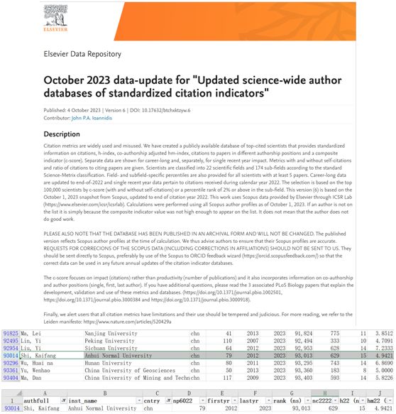 据悉,全球前2%顶尖科学家榜单是Elsevier与斯坦福大学John P. A. Ioannidis教授团队合作的项目成果,发布在Elsevier旗下的Mendeley Data网站上。榜单基于Scopus数据库的引用数据系统分析,以被引数(区分自引和他引,提供自引数据)、H指数、HM因子等6种综合指标,根据“生涯影响力”和“年度影响力”从近700万名科学家中遴选出世界排名前2%的科学家,为科学家长期科研表现提供了一个衡量指标,能够更客观、更真实地反映科学家的影响力(引自《读创》2022.4.19)。