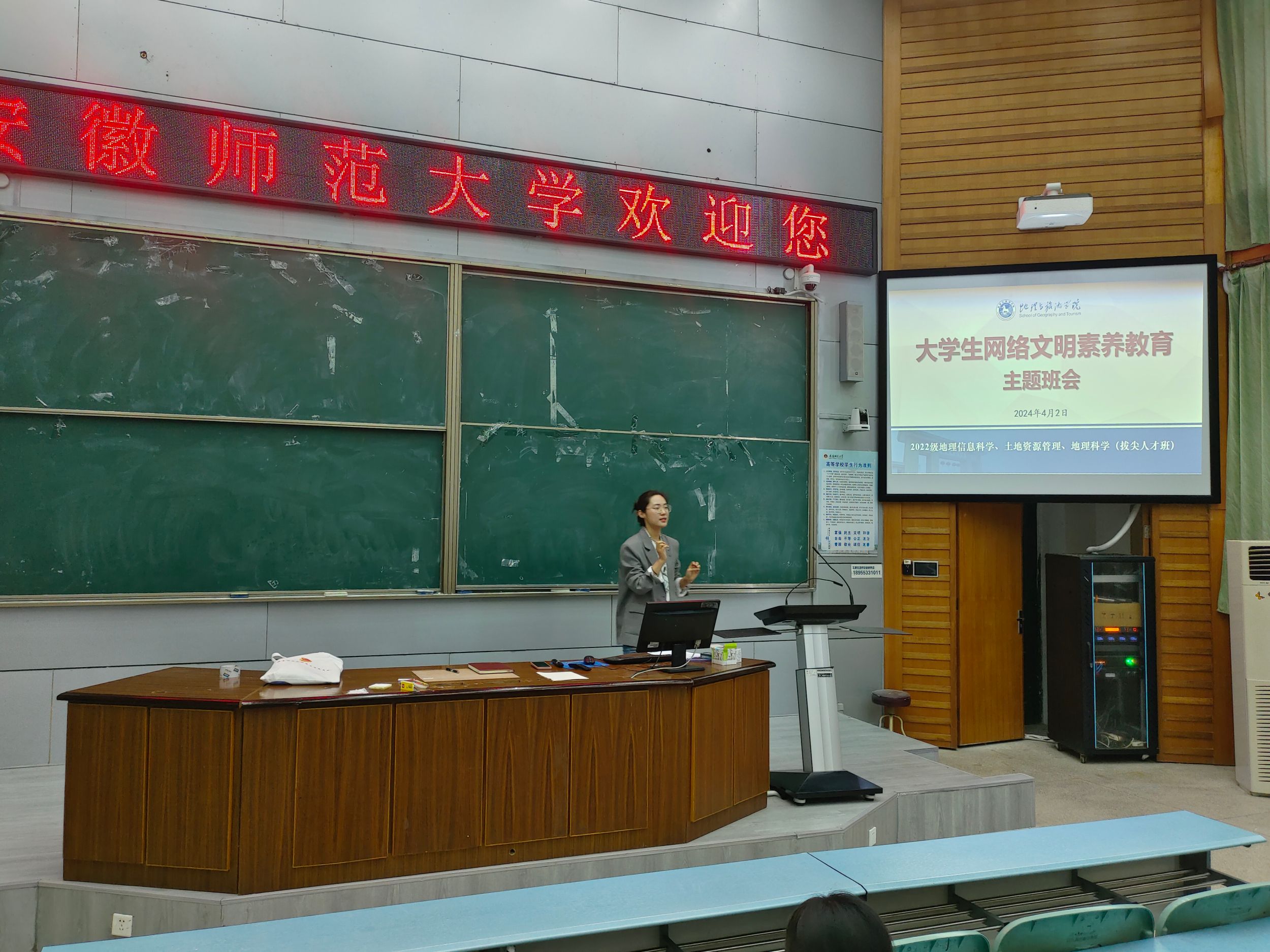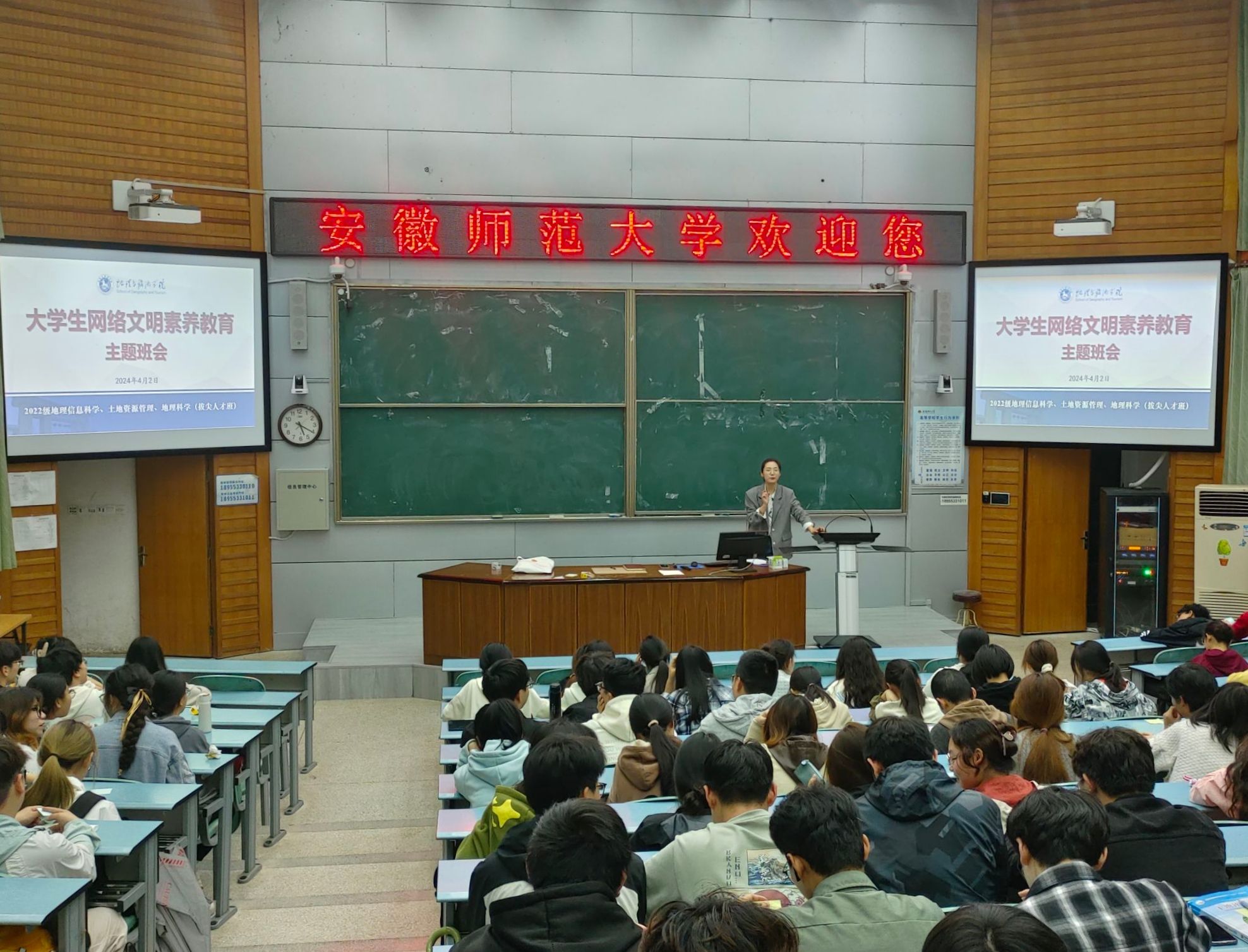 郑采奕、陈祥云)4月2日下午,2022级地理信息科学、土地资源管理、地理科学(拔尖人才班)专业于行知楼2010105教室开展大学生网络文明素养教育主题班会。班会由辅导员陈祥云主讲,2022级地理信息科学、土地资源管理、地理科学(拔尖人才班)专业全体同学参加。