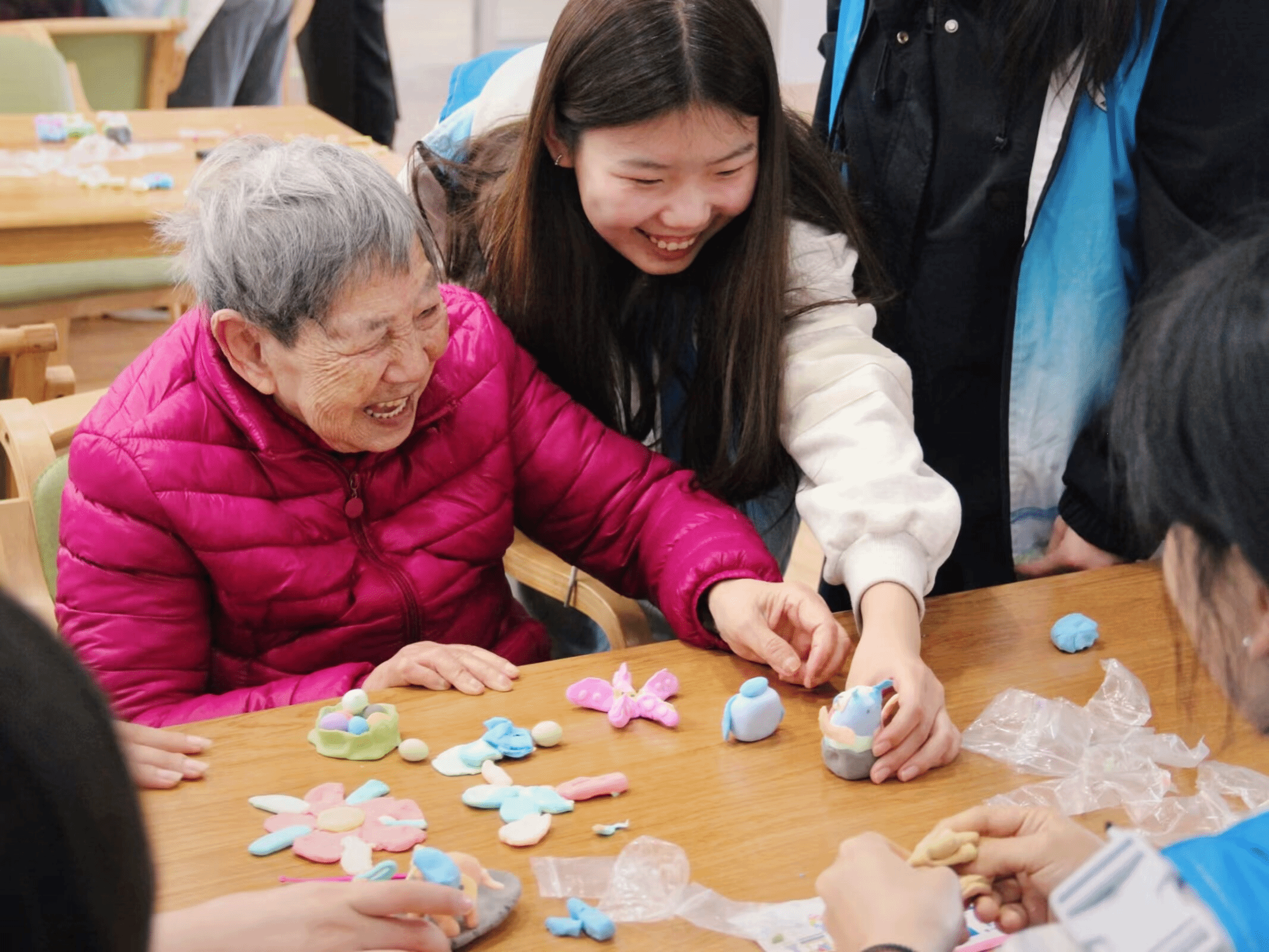 欣赏完三场表演,志愿者们带领所有爷爷奶奶们一起做律动操,大家纷纷举起双手跟随着音乐节拍欢快地舞动,脸上洋溢着欢乐的笑容。爷爷奶奶们也为志愿者们表演了大合唱《黄河》,即使年迈,却也依旧能感受到爷爷奶奶们中气十足的状态。活动的最后,志愿者们拿出准备好的材料,与爷爷奶奶们一起用粘土做手工,大家充分发挥着想象力,用粘土创造出一个又一个新意十足的作品。活动现场的气氛轻松愉悦,老人们与志愿者们相处融洽,笑声不断。