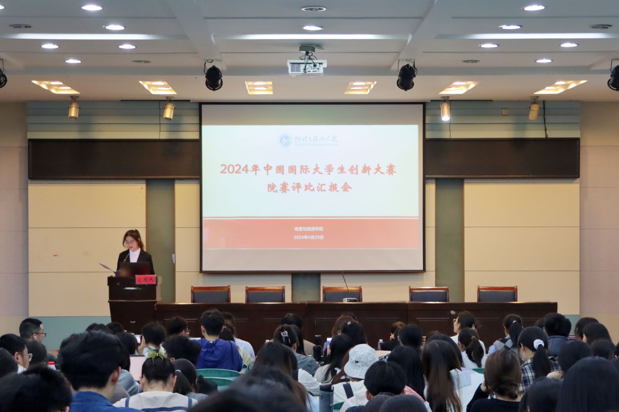 在学院实验楼101报告厅举行了2024年中国国际大学生创新大赛院级评选报告会。创新创业教育学院教师甘伟、旅游管理专业教师杨效忠、地理科学专业教师孙鹏、地理信息科学专业教师徐培培、城乡规划专业教师姚景艳、土地资源管理专业教师程超、院团委书记韦银艳、参赛团队队员及各班级学生代表参与此次活动。
