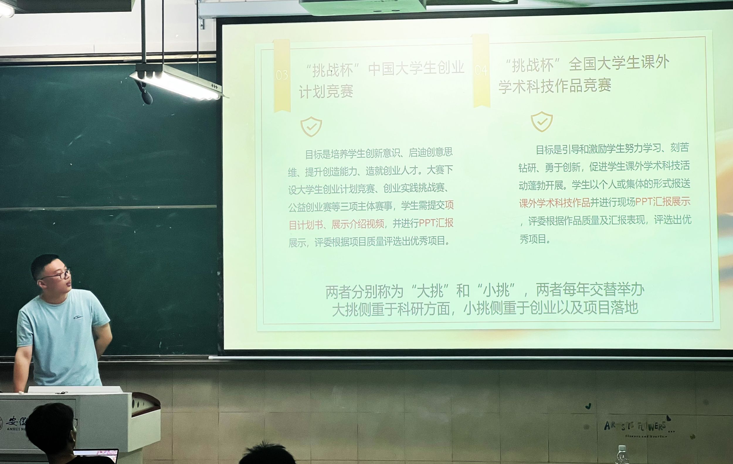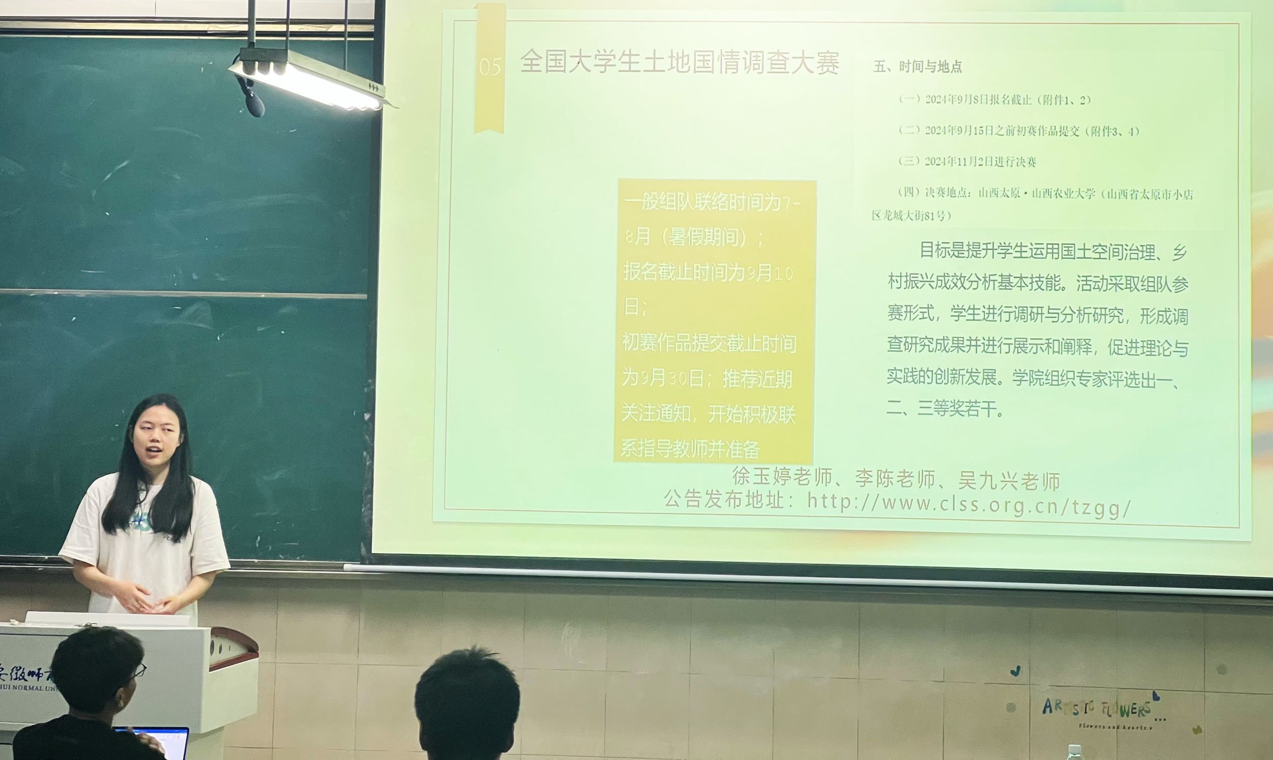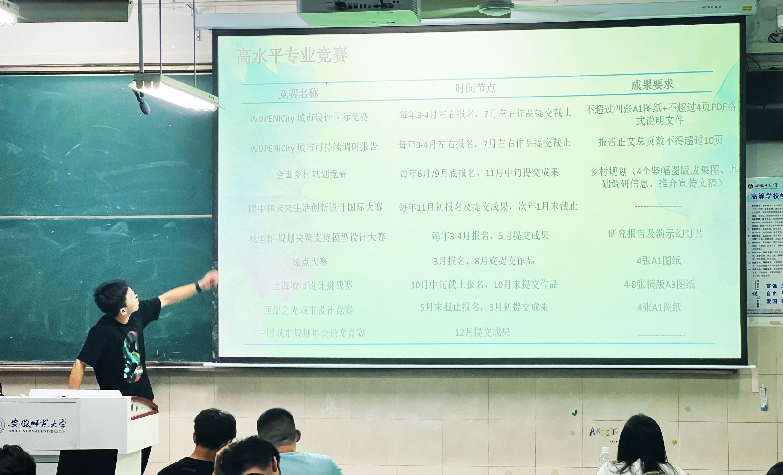 胡羽阳同学首先介绍了“互联网+”、“三创”、“挑战杯”等国家级权威赛事的内容、形式及参赛流程,正如古人云:“会当凌绝顶,一览众山小。”,他鼓励大家要勇于尝试,不畏挑战。赖淑媛同学随后分享了自己在挑战杯、土地国情调查、不动产估价技能大赛等竞赛中的宝贵经验,提供了在时间管理、资料搜集和团队协作等方面的策略和技巧,她建议大家结合即将开展的暑期社会实践及下学期的相关课程,将成果认真打磨优化,与竞赛相结合,以赛促学,以学促赛。李诗毅同学则着重介绍了国土空间规划技能大赛,鼓励两个班级跨专业合作组队,通过知识融合、技能互补,充分发挥每个成员的专业优势,增强团队的综合竞争力。王冰冰同学就学科竞赛的重要性进行了阐述,参与学科竞赛不仅能够锻炼同学们的专业技能,而且能培养团队合作精神和解决问题的能力。李长乐同学则从挑选竞赛原则的角度,引导大家选择适合自己能力的竞赛项目。