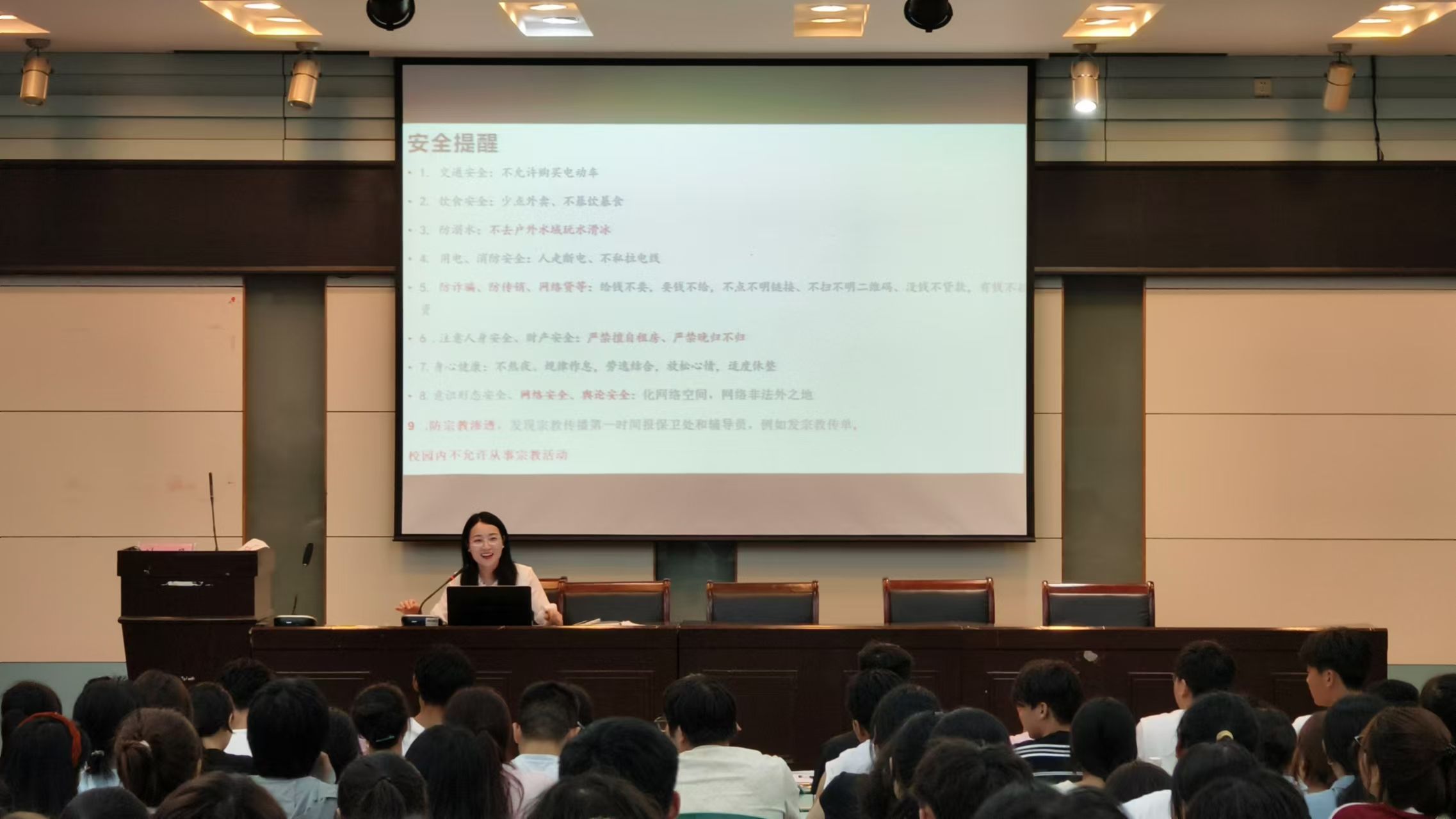 实验楼101报告厅召开“保持热爱,携手同行”开学第一课主题班会,旨在帮助大一新生尽快适应大学环境,调整身心状态,开启大学新生活。班会由辅导员彭媛媛主持,各班全体成员参会。