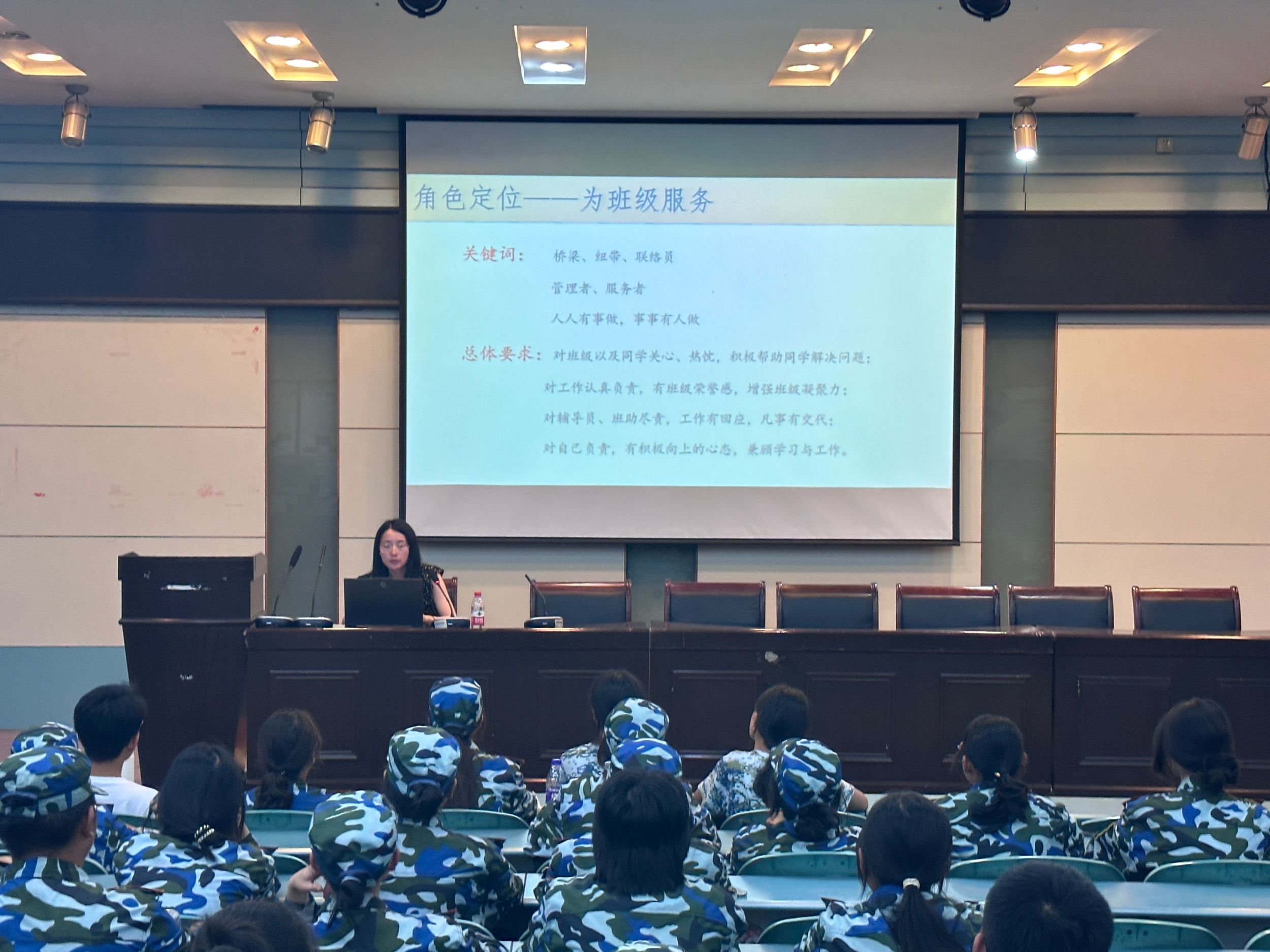 接着,彭媛媛详细阐述了班委的角色定位与工作要求。她强调,班委要具备高度的责任心和使命感,要时刻关注班级的动态,及时了解同学们的需求和困难。同时,班委之间要密切合作,形成团结向上的班级氛围。她强调,班委在班级中扮演着同学与老师之间联系的桥梁和纽带的重要角色,既是联络员,也是管理者和服务者。这就要求班委秉持着“人人有事做,事事有人做”的理念,在工作中放平心态,以服务者和合作者的姿态出现,相互尊重理解,并且注重工作的方式方法。在具体事务方面,班委在布置工作后要做好工作记录,同时重视收集与反馈工作。