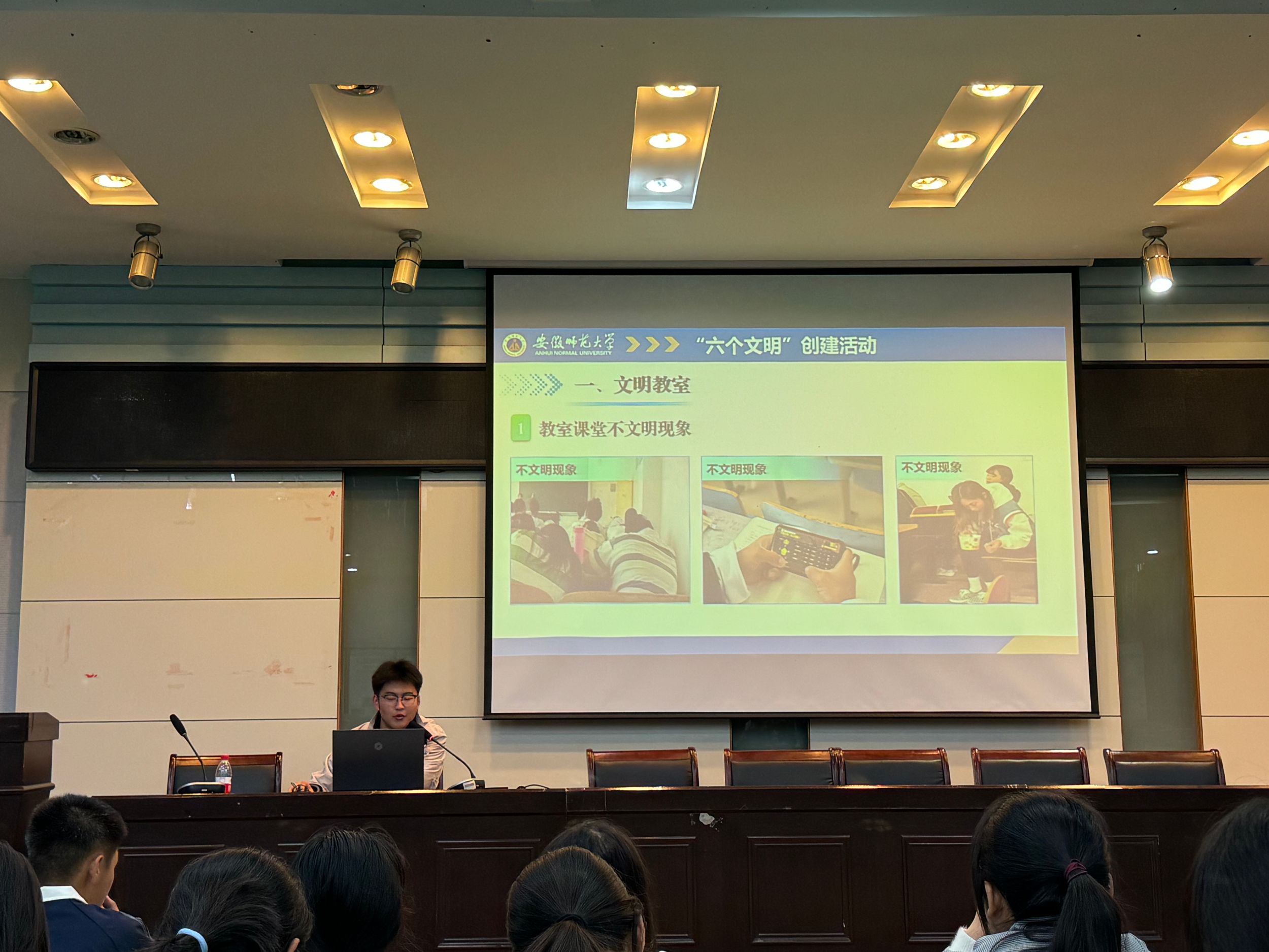 关于开展大学生“六个文明”教育实践活动的实施方案》及《深化大学生“六个文明”教育实践专项活动方案》,包括文明教室、文明宿舍、文明就餐、文明交通、文明交往、文明上网六个教育实践专项活动并着重强调了遵守校规校纪的重要性。沈涵说道,全体同学要以“主人翁”的意识持之以恒地努力付出,不断增强思想自觉,充分认识到培养文明习惯和修身意识对同学们成长成才的重要意义。