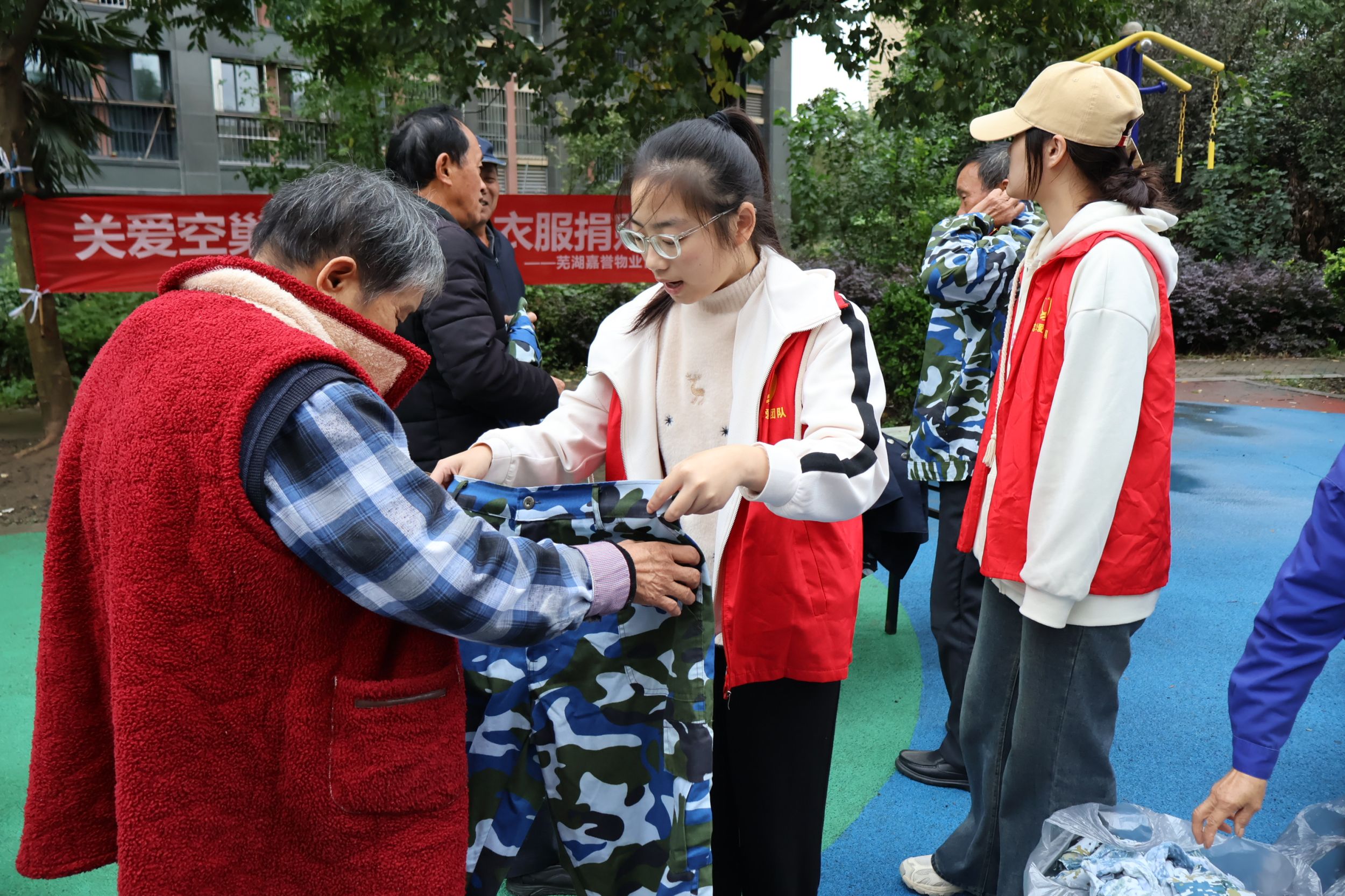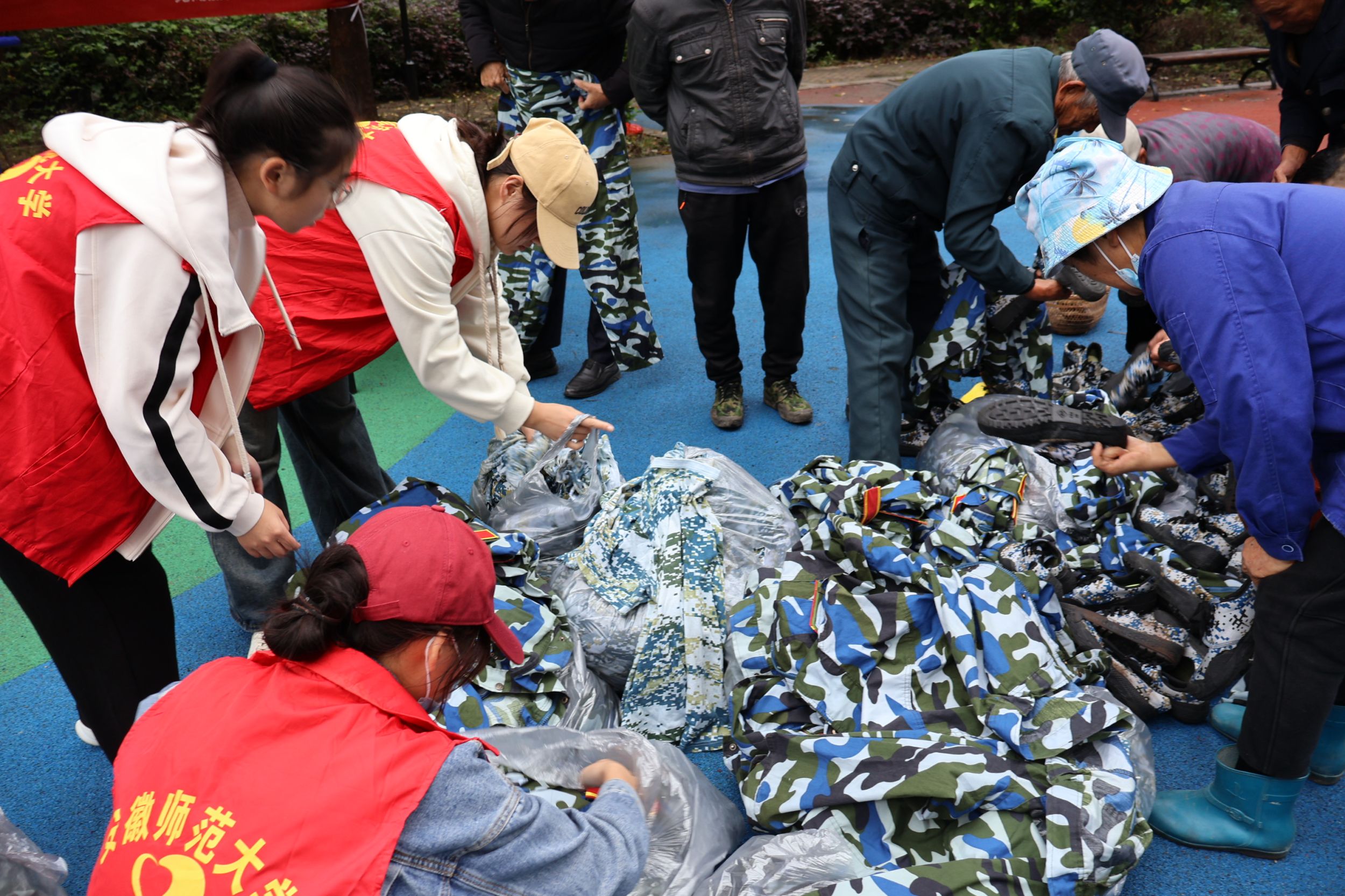 经过18天的辛勤工作,军训服终于以崭新的面貌在10月27日的捐赠活动现场亮相。尽管天气阴雨,但老人们依然热情高涨,纷纷前来领取衣物,脸上洋溢着感激的笑容,并对现场的工作人员表示感谢。