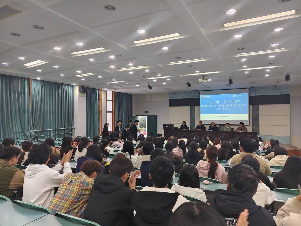 11月6号,地旅与旅游学院旅游管理专业在实验楼101报告厅开展“学.思.享大讲堂” 旅游管理专业“旅游目的地认知实习”朋辈分享会,参加本次会议的有旅游管理专业教师杨钊、张伟、洪娟、钱璐,24级旅游管理专业辅导员沈涵,2023级旅游管理专业老生代表及2024级旅游管理专业全体新生,本次分享会由钱璐主持。