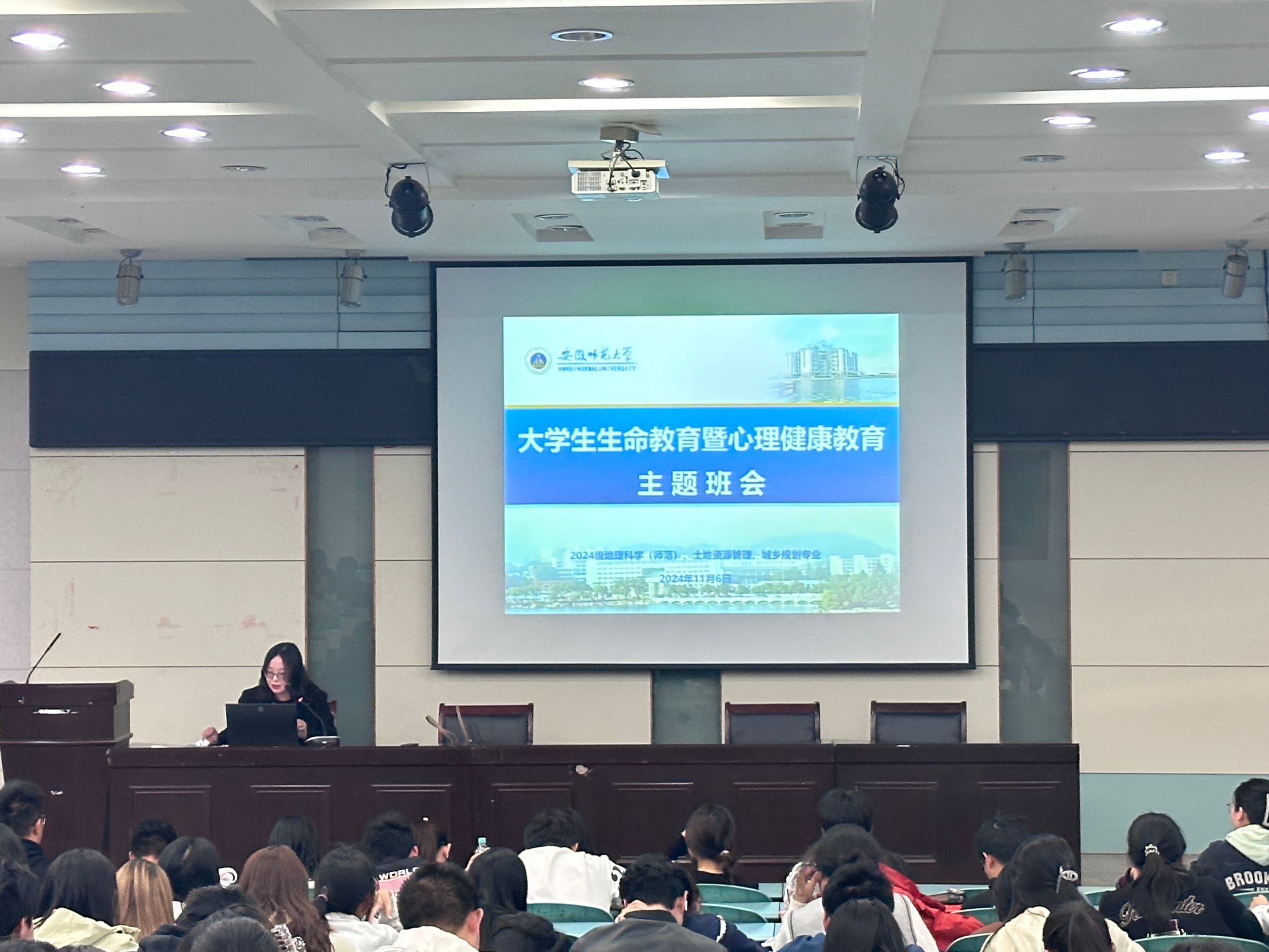 于11月6日下午,在实验楼101报告厅举行了“大学生生命教育暨心理健康教育和深化六个文明教育实践”主题班会。本次班会由辅导员助理章怡晨主持, 2024级地理科学、土地资源管理、城乡规划专业全体学生参加。