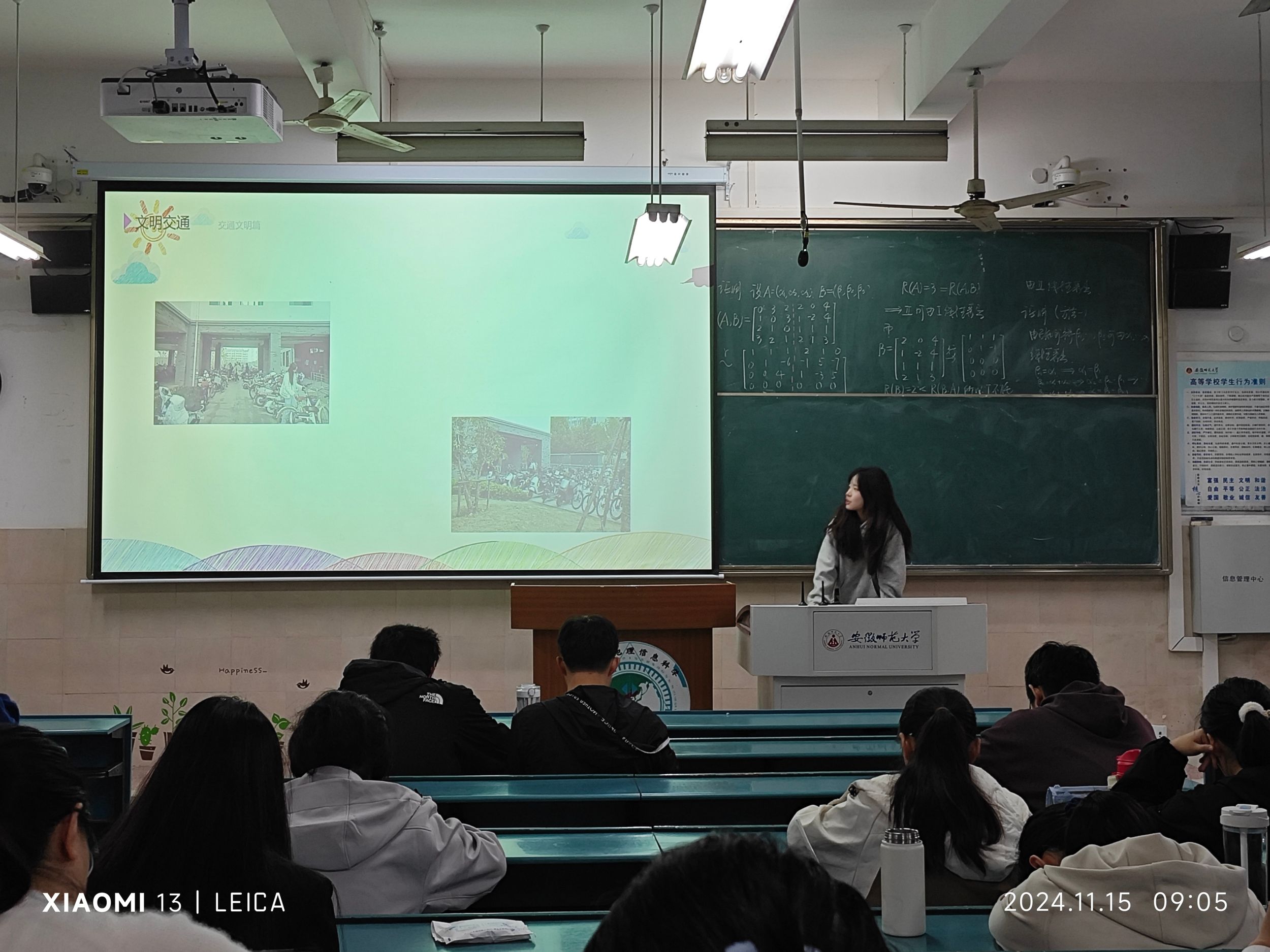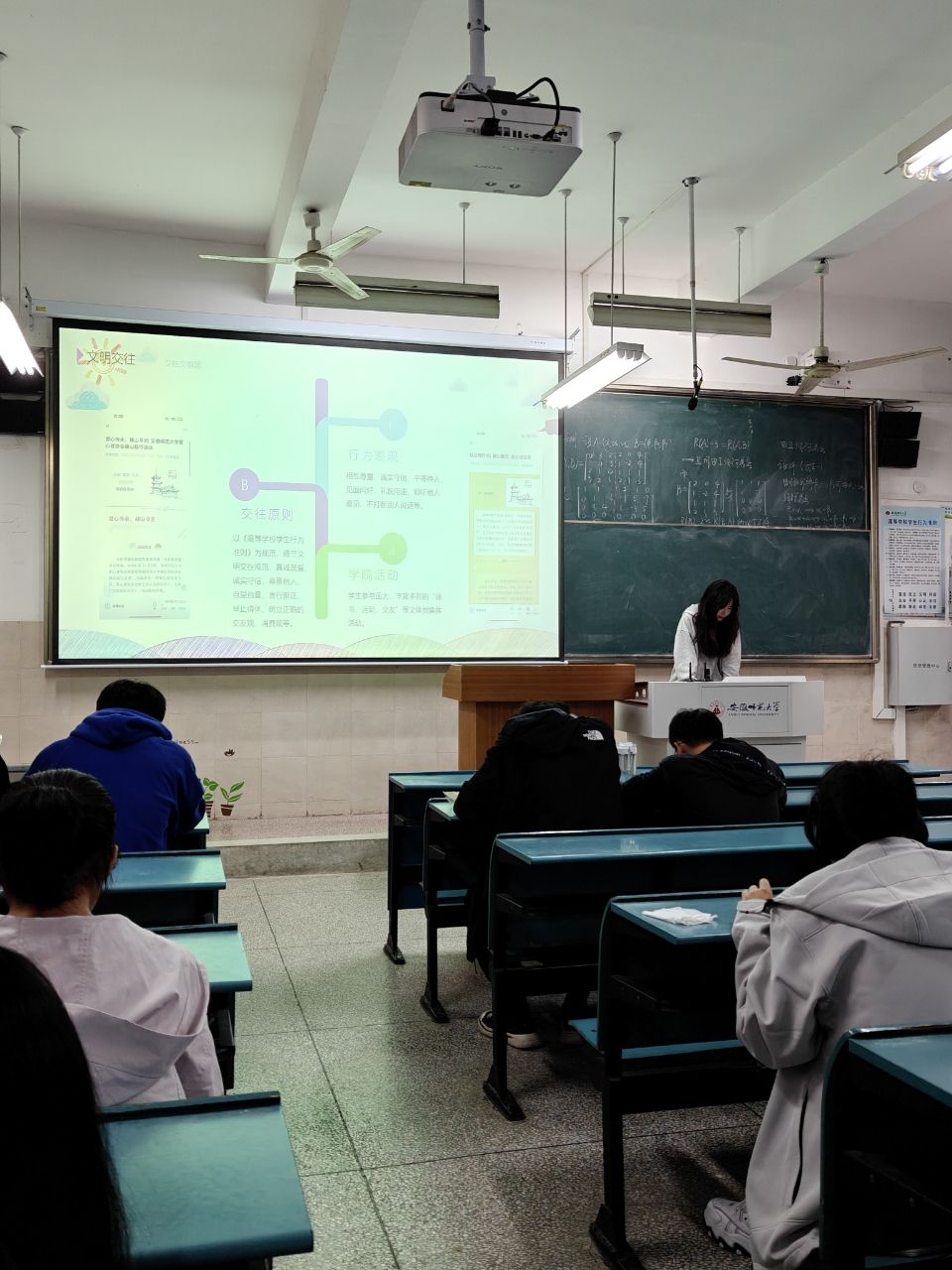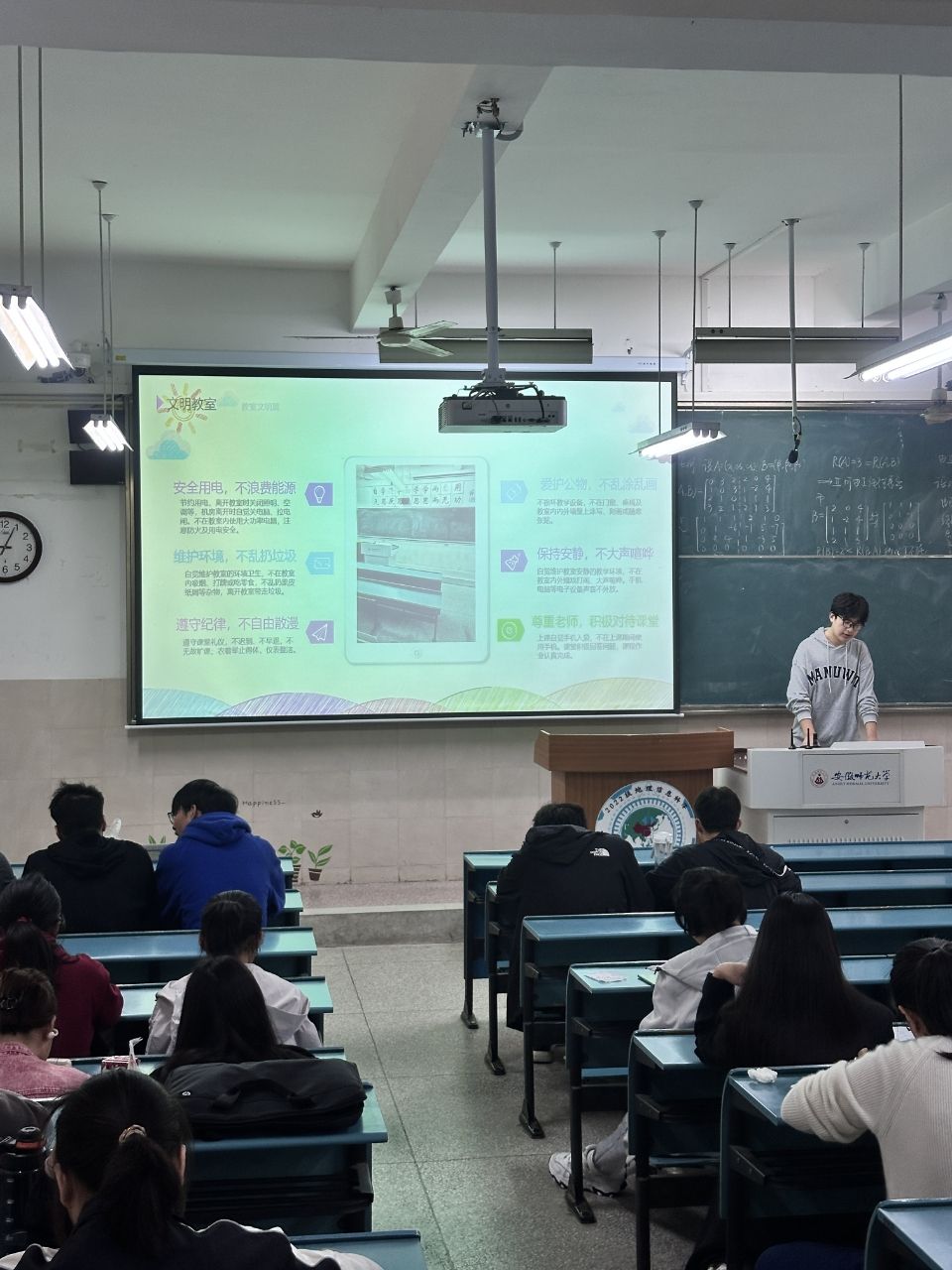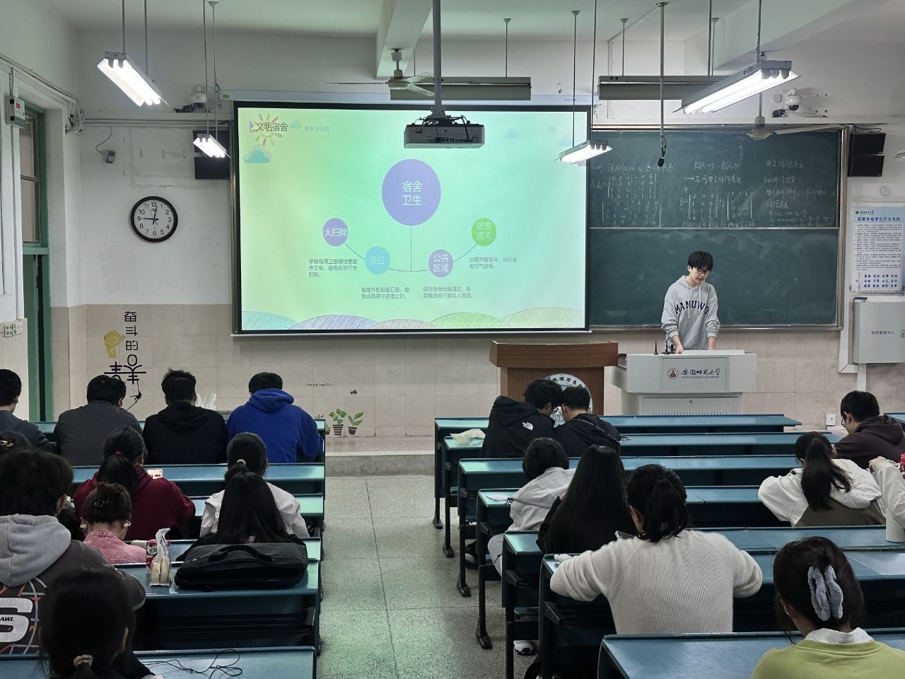 班会伊始,主持人通过生动的讲解和有趣的案例,深入阐释了“文明宿舍、文明教室、文明就餐、文明交通、文明交往、文明上网”六个方面的重要意义,积极引导同学们反思日常行为。同学们认真聆听,不时互动交流,现场气氛热烈。