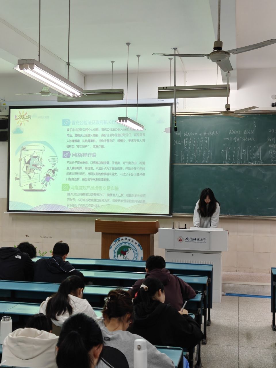 文明上网部分,主持人结合常见网络诈骗案例,如冒充公检法及政府机关诈骗、网络刷单诈骗、网络游戏产品虚假交易诈骗等,提醒同学们提高警惕,保护个人信息安全。同时,倡导大家遵守网络文明公约,文明用语、不信谣不传谣、理性表达,积极传播正能量。