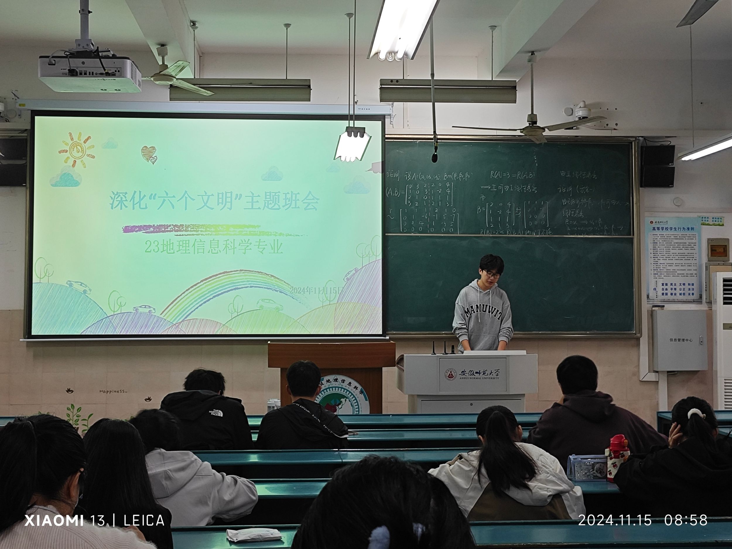 2023级地理信息科学专业于教学楼103成功举办了一场以“深化‘六个文明’”为主题的班会,旨在提升学生文明素养,推进校园文明建设。此次班会由赵毅衡、徐智美主持,全班同学积极参与。